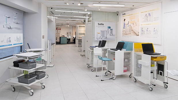 近年増えつつある、病室内の患者のそばで業務を続ける看護の運用に適したカートです。病室での一日の看護師業務を、患者に寄り添いながら、安心して快適に行うことができる新しいワークスペースを提案します。