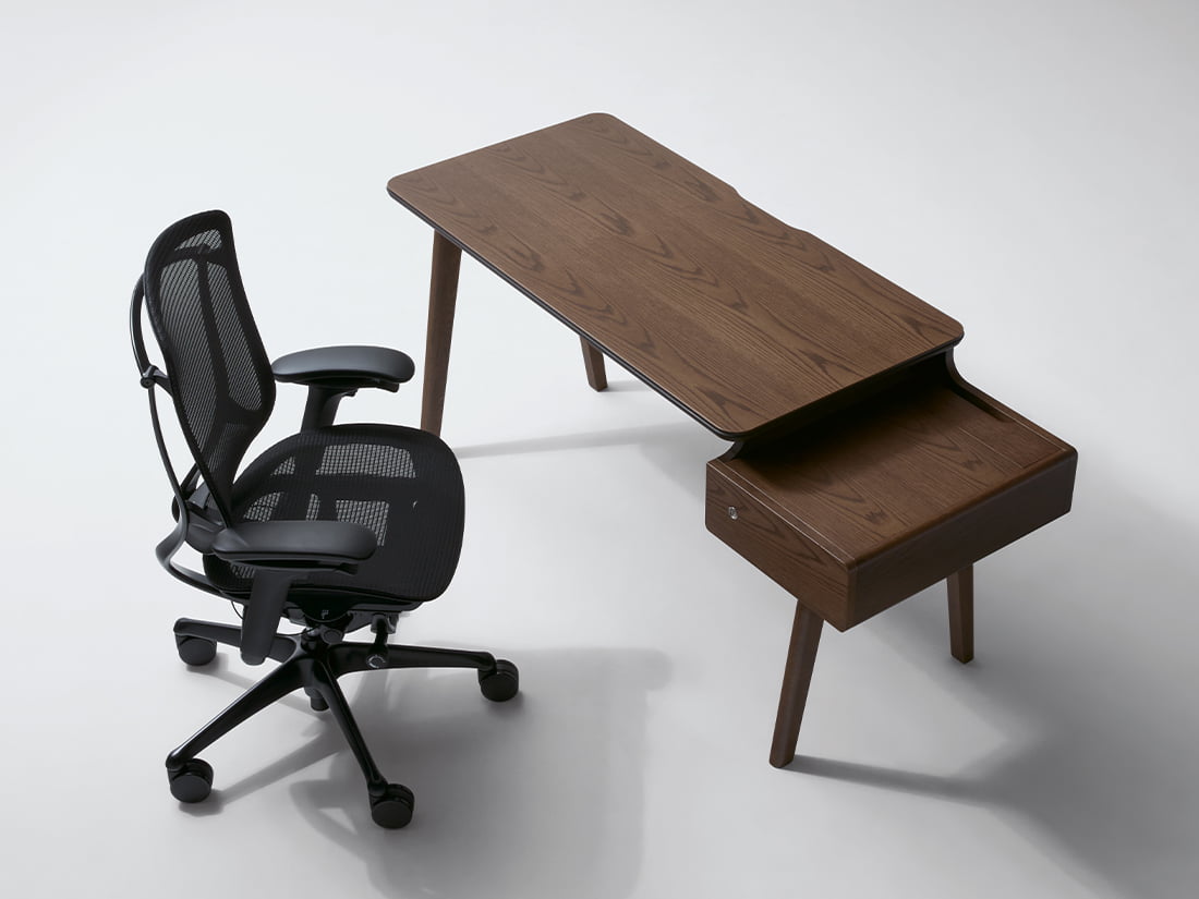 機能も質感も妥協しない、品格を備えたエグゼクティブデスク。象徴的な段違い天板が生み出す使い勝手の良さと、きれいを保つ工夫により、書斎にふさわしい一台。