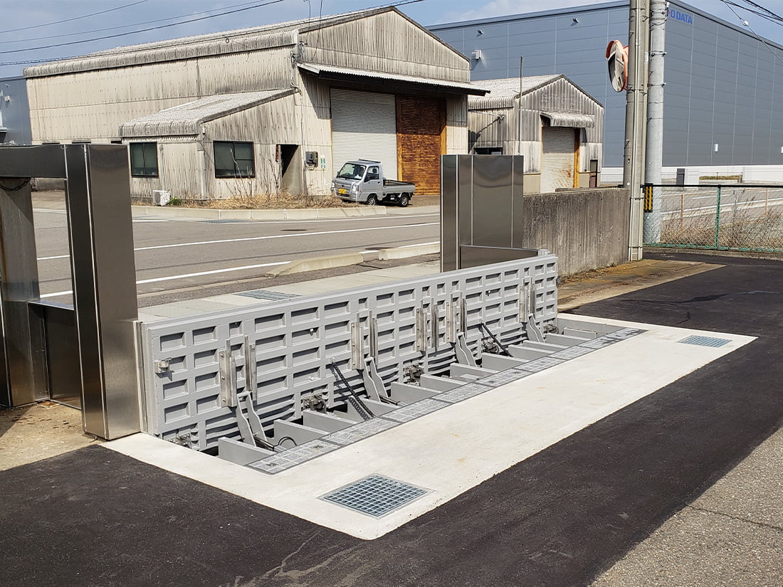 業界初の自己診断機能を搭載した電動起上式防水板SuiZinは、防水板を起上させることなく情報を取得でき点検が可能です。必要な時に確実に使用する為の防水機能を維持し、建物や地下を浸水から守ります。