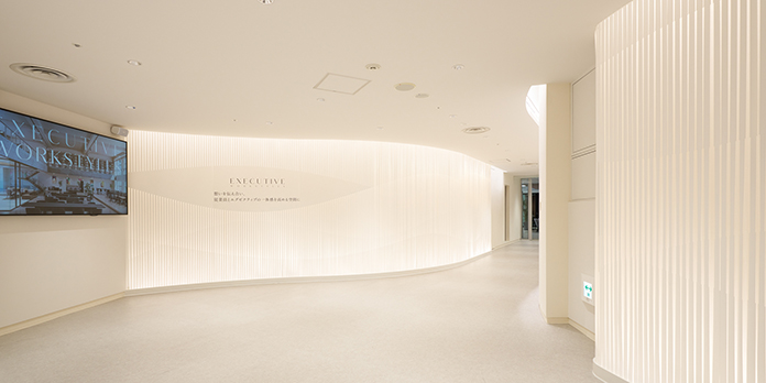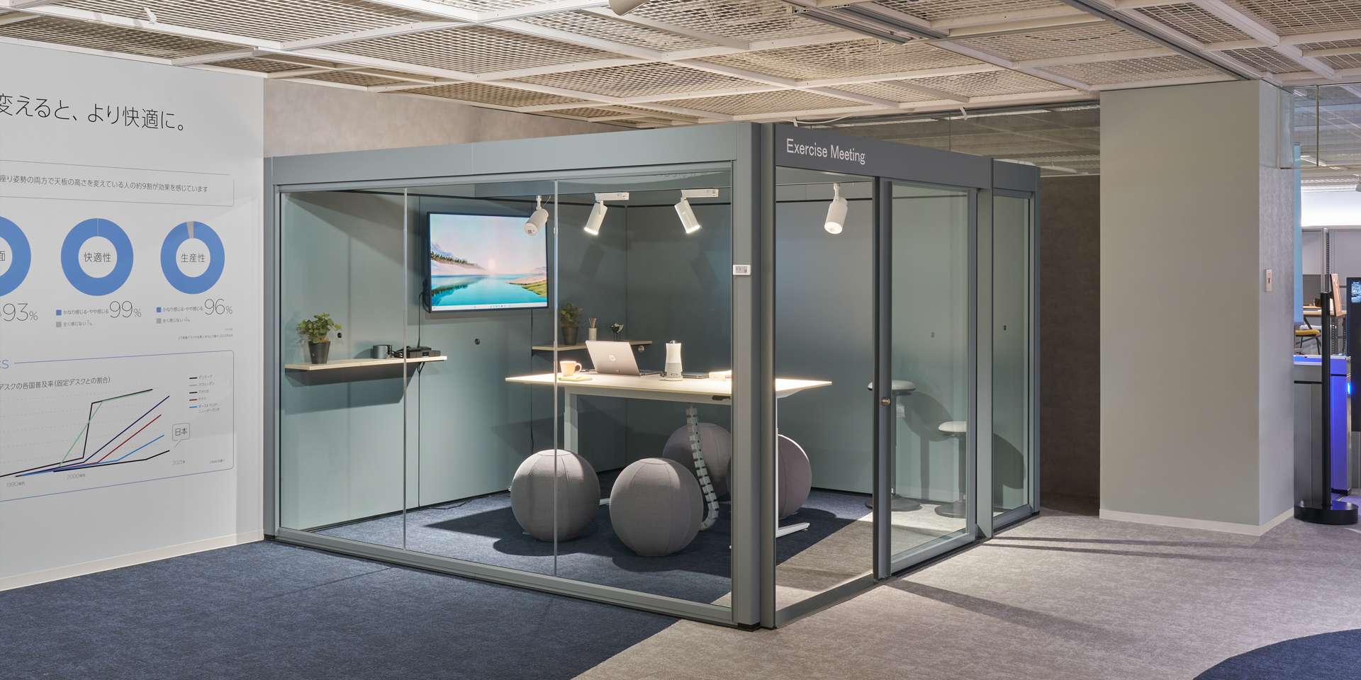 開放感のあるガラスパネルで仕切られた空間にバランスボールとストレッチバーを設置しました。打ち合わせの合間に身体を動かして気分転換。働く人の健康にも配慮した打ち合わせ空間です。