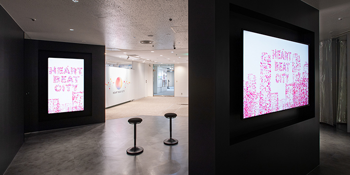 テーマである「Beat =鼓動」を円のアニメーションで表現。それらが「人」に変化し、さらに「街」のさまざまなシーンへと変化します。音楽と共に聞こえてくるのは、街の雑踏などの効果音。それらの映像と音を鑑賞することで、ショールームに居ながらにして「オカムラ製品が街中に広がり賑わう様子」を鑑賞者に体験してもらうことを目指した空間です。