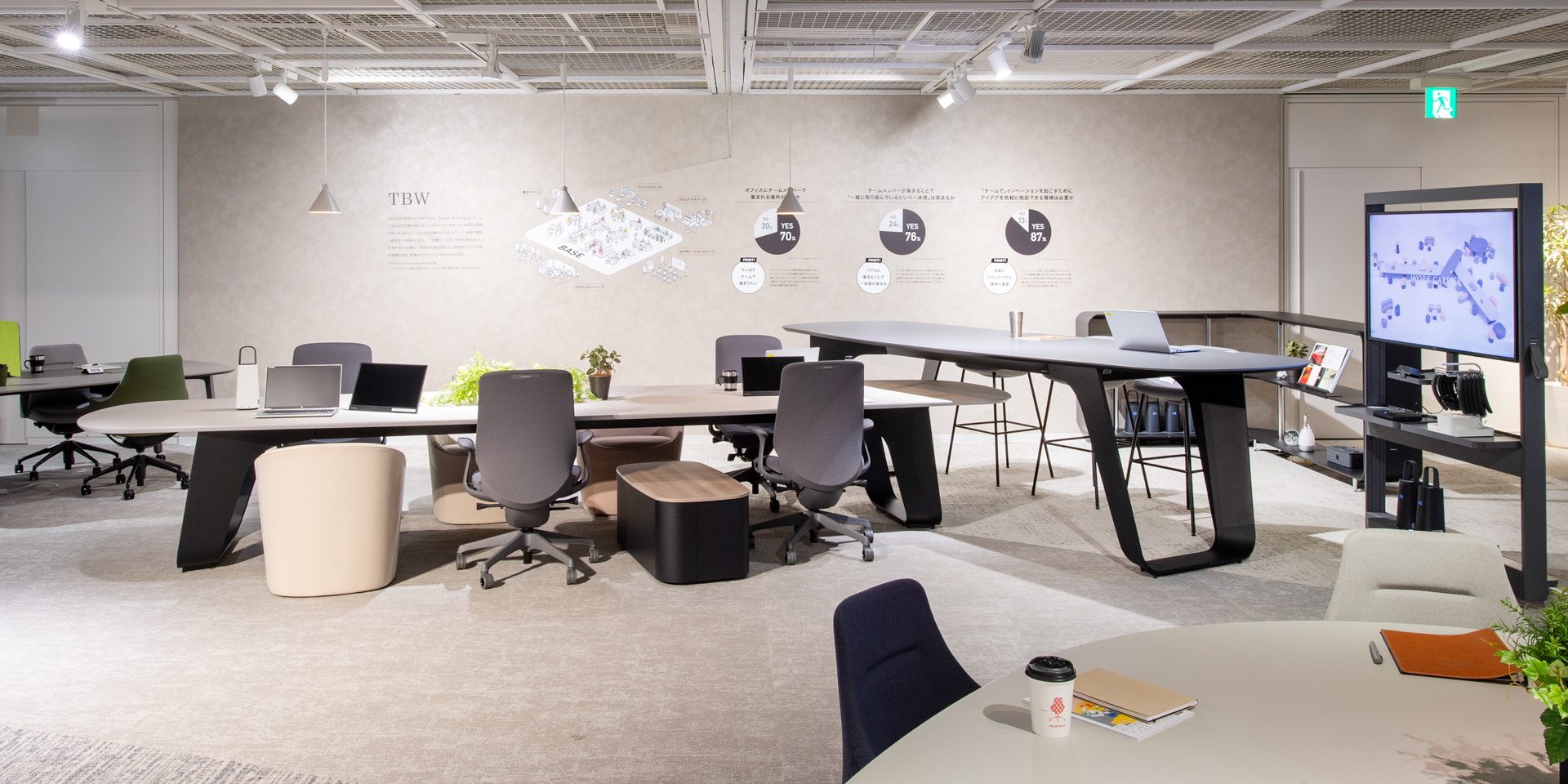 つながりを、はぐくむ。ワークアイルは人と人の距離や位置の関係性に着目し、快適な個人作業の場と、偶発的なコミュニケーションを生む場の両立を目指しました。個人作業を行いながら日常的に、ゆるやかに、人と人のつながりをはぐくみます。