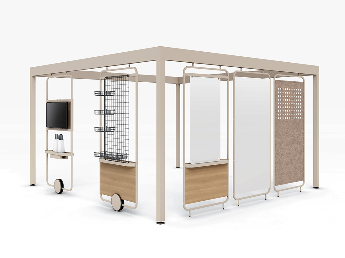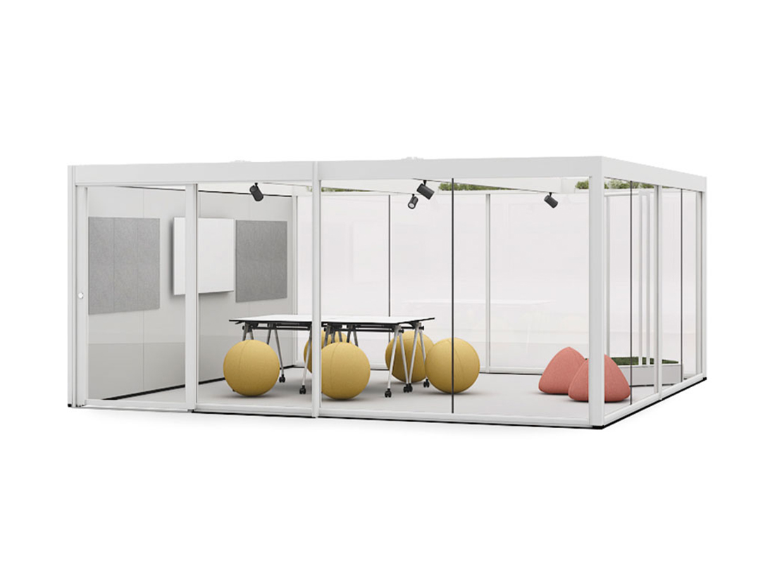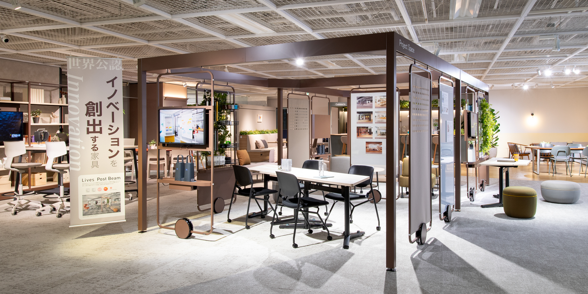 ルーム・イン・ルームの設えで、空間にあわせて様々なカラー展開ができるポストビーム。ビームに設置できる多彩なパネルにより、快適な「チームビルディング」を実現します。