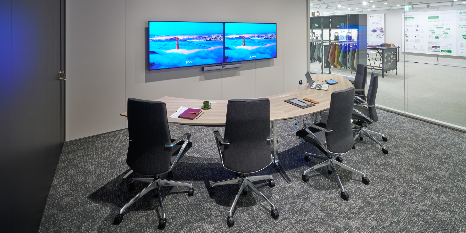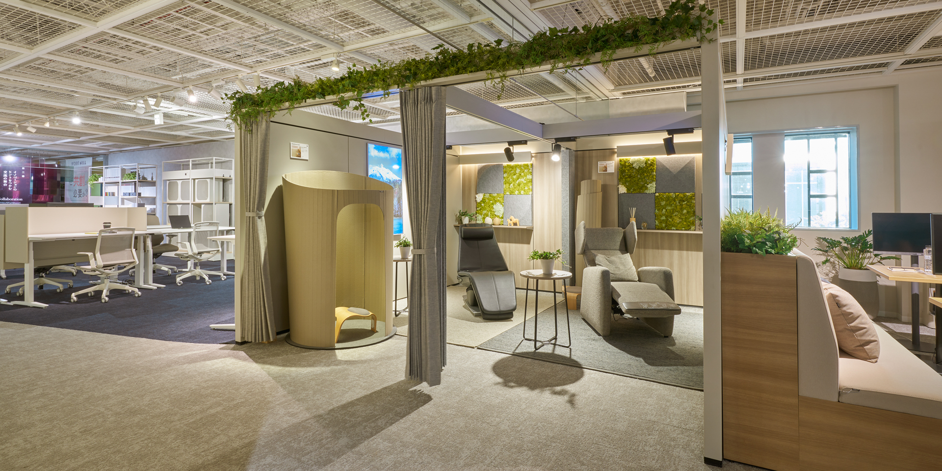吸音効果の高いカーテンとバーチカルブラインドで仕切られた空間は快適な音環境をつくります。リラックスしての休憩や短時間の仮眠、瞑想時間などは、仕事のパフォーマンスを向上させます。快適な環境で一休みできるワークナップ空間です。