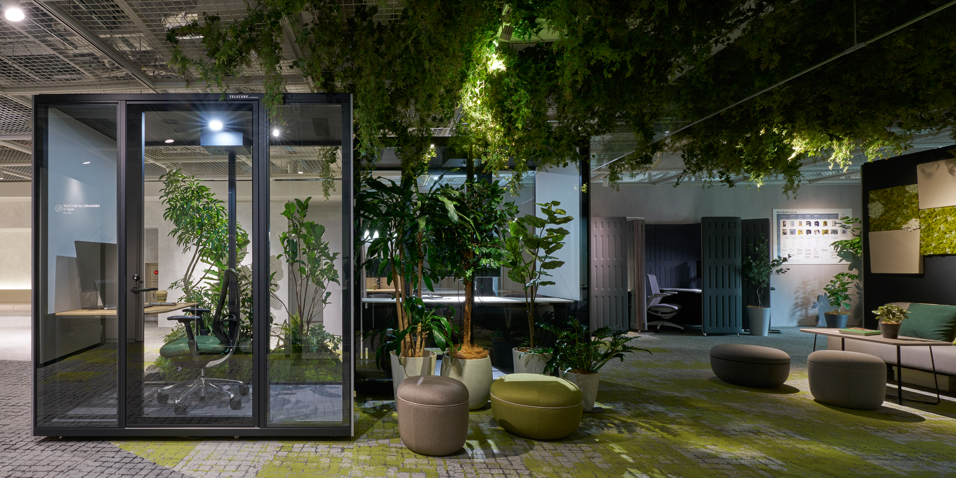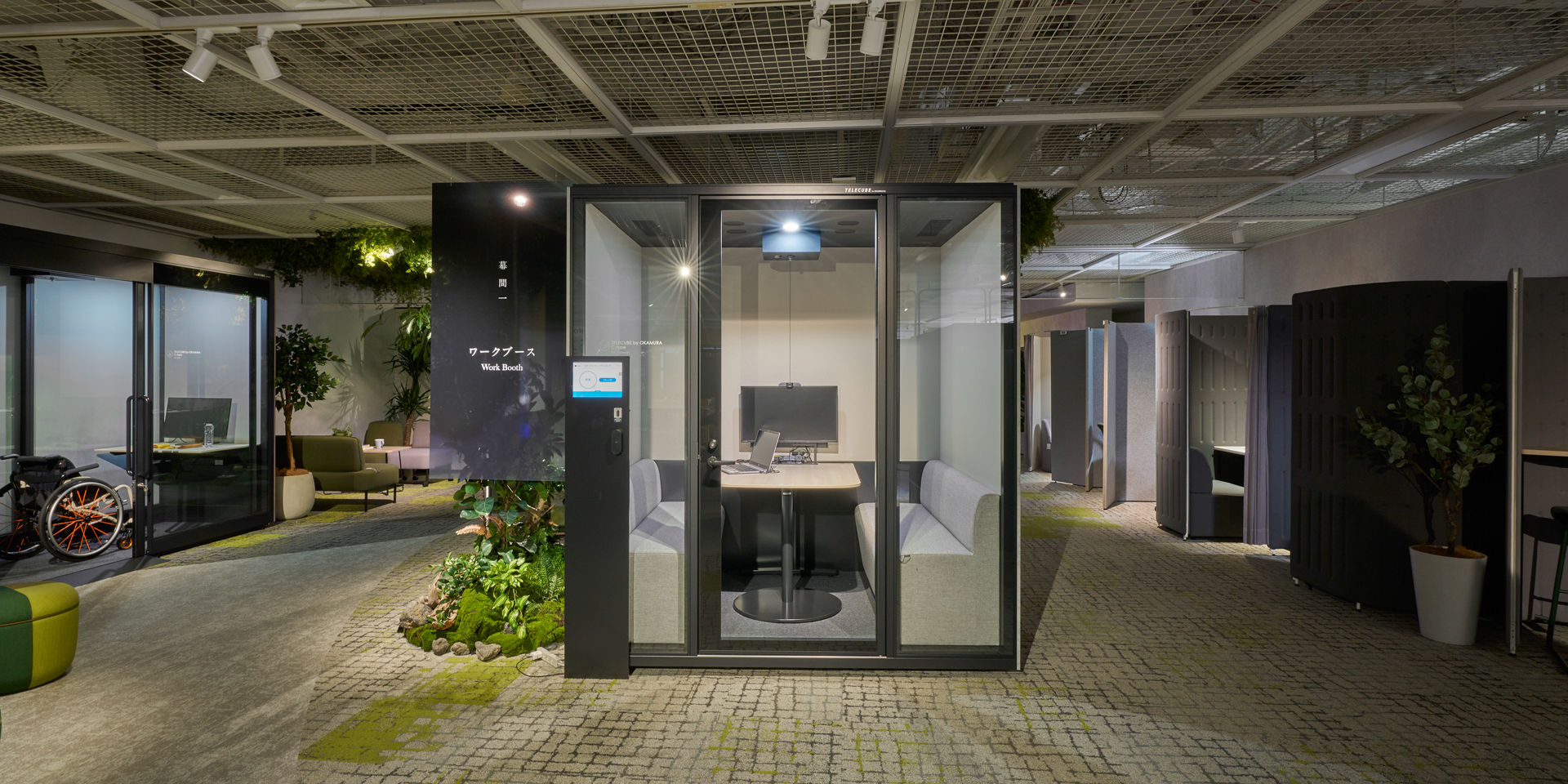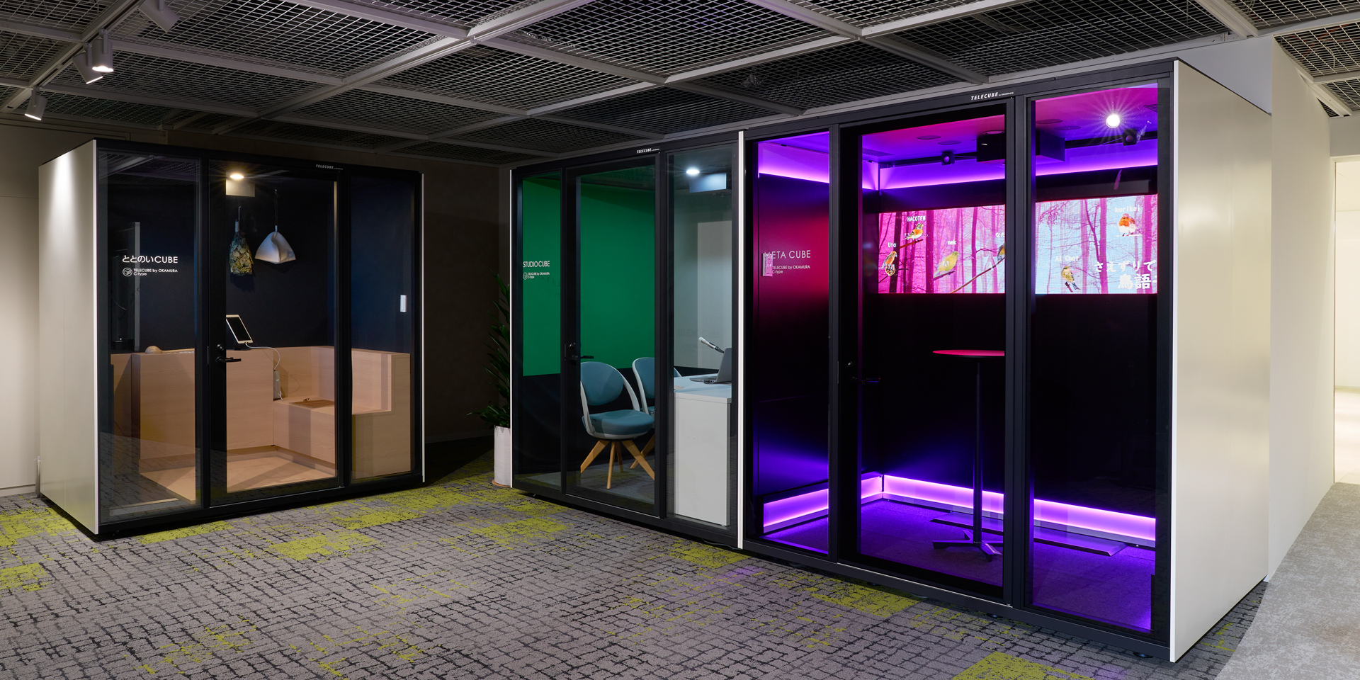 イノベーションを生むための集中環境をつくるワークブース。目的や用途に合わせて、的確に配置することで、はたらき心地の良いオフィスをつくります。配置に工夫を行うことで、空間に余白が生まれ、ワークブースでも開放感を演出することができます。WEB会議や1on1、集中など用途別のワークブースの可能性をテレキューブの企画展示を通して表現しています。