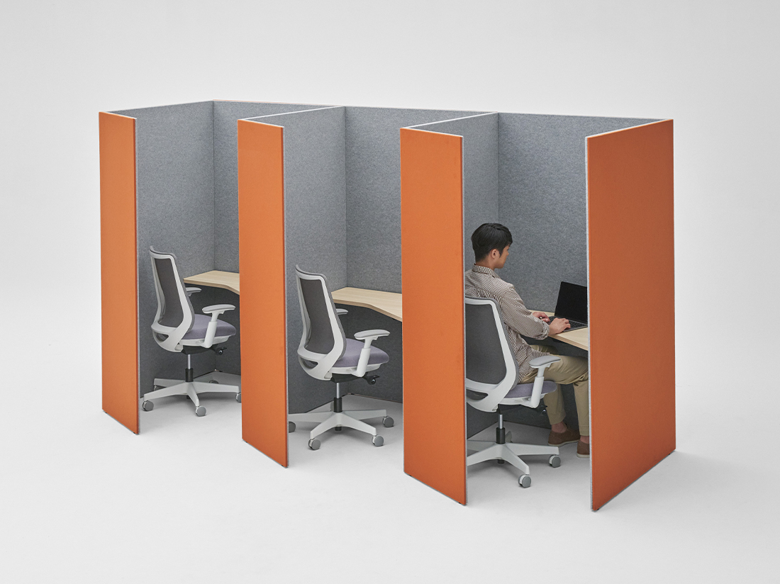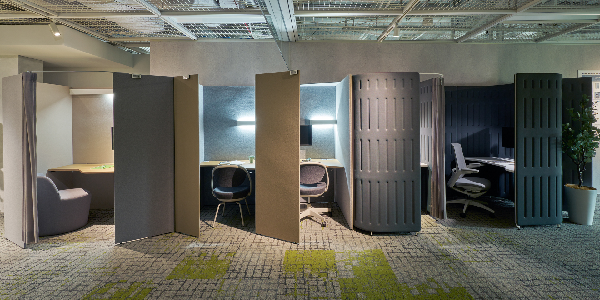 個人とチームそれぞれに快適な環境を構築するパネルシステム型ワークブース。muffle+ は外部からの視線や音などの刺激から守り、中にいる人の緊張感を程よく和らげてくれるワークブースです。