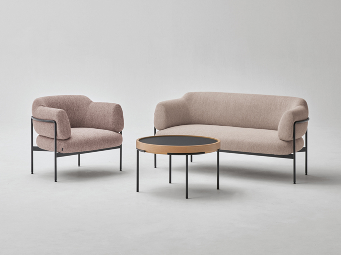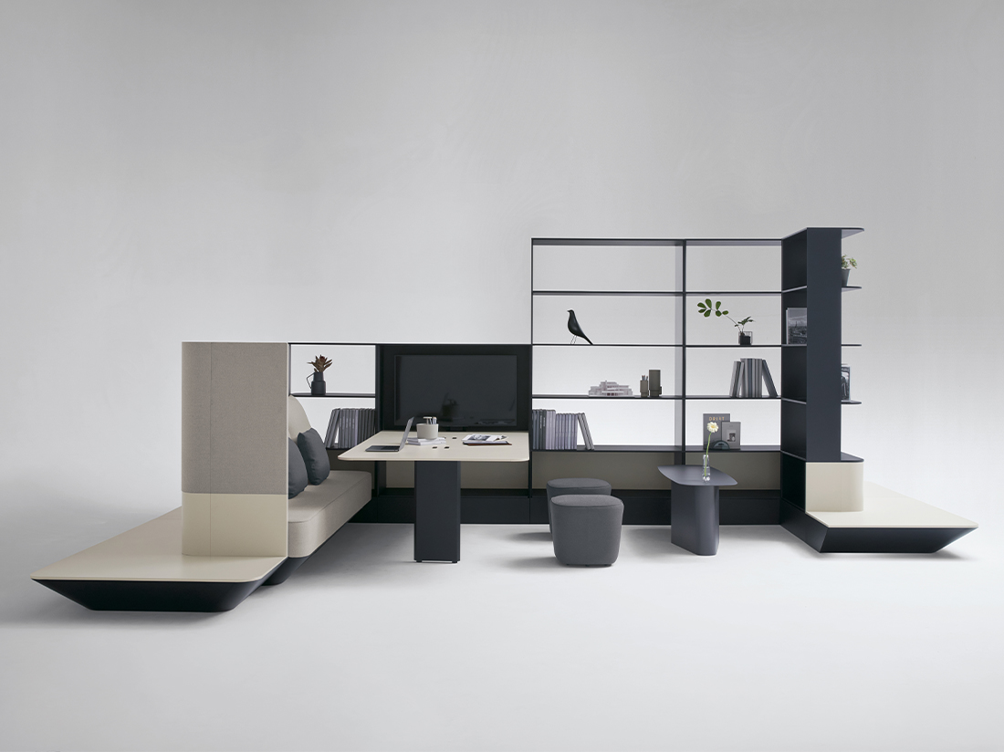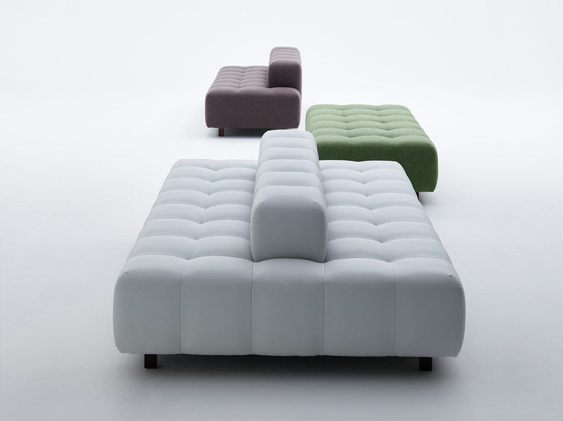 ソファか、ベンチか。オフィス空間に自由と楽しさを。300mmのキュービック・モデュールで構成され、長さも幅もシングルとダブルの使い方に対応し、張地も最新の人工皮革からモダンなフェルト生地まで用意しています。