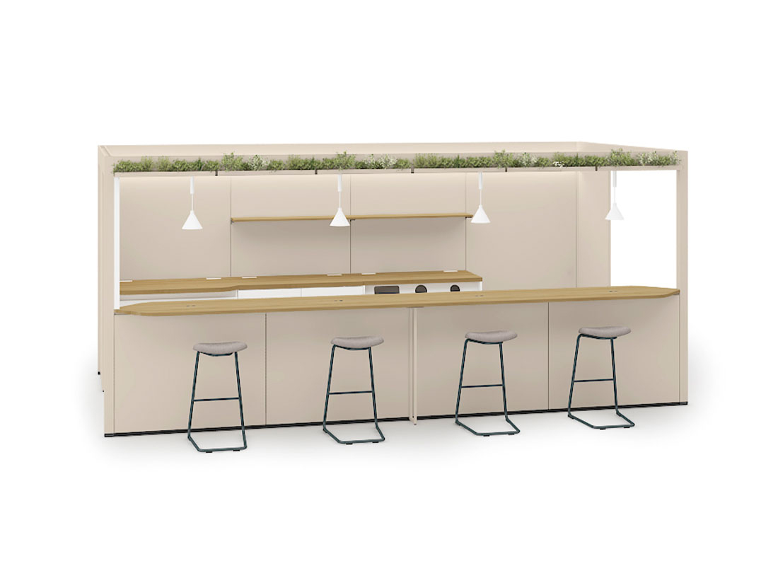 ハイカウンターや飾り棚、プランターボックスが設置でき、カフェキャビネットとの組み合わせで、場所を選ばず簡単に設えることができます。執務の合間にほっと一息。偶発的な出会いを生み出すカフェ空間です。