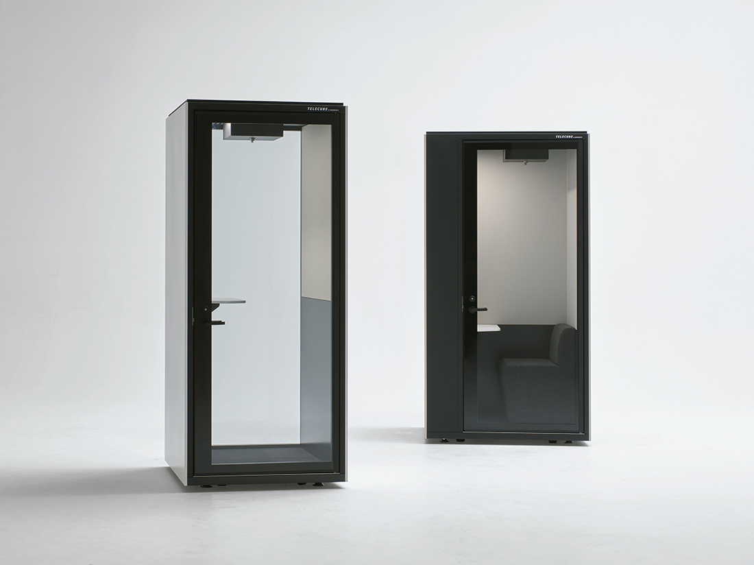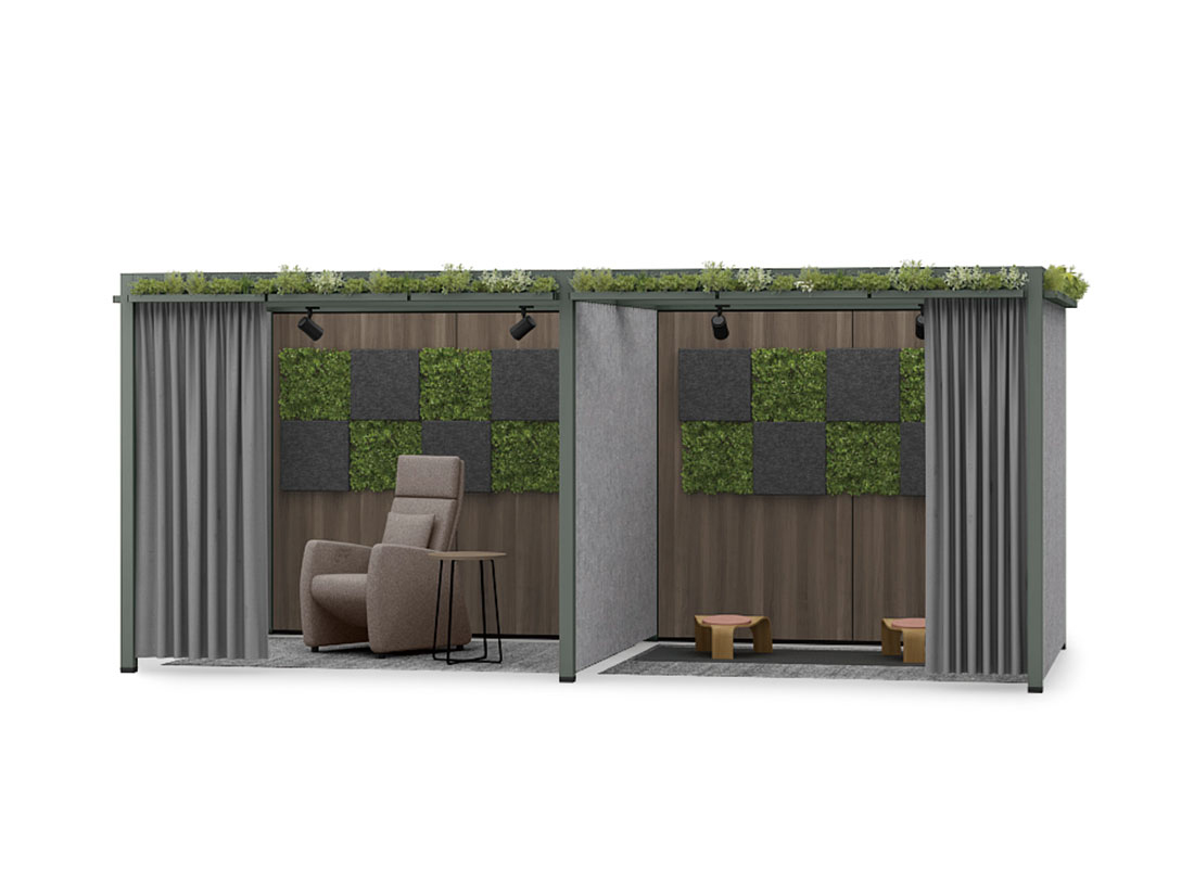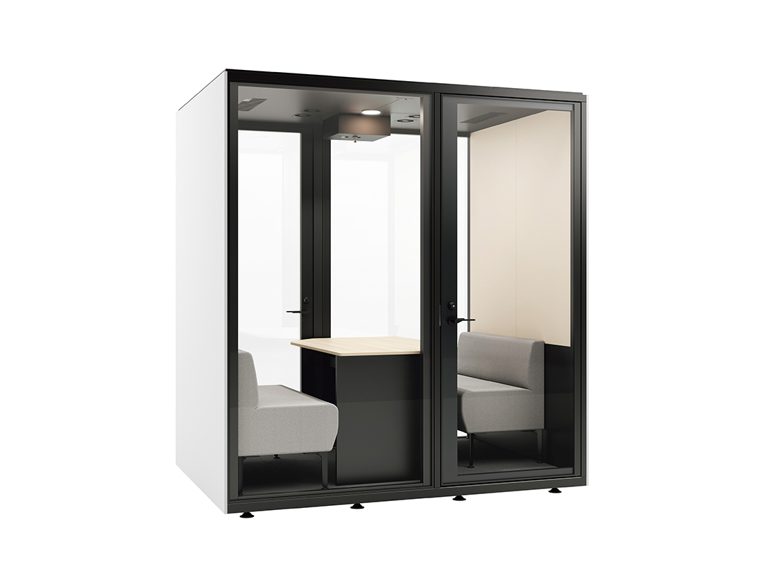 機能性と環境配慮を両立した「サステナビリティ」ワークブース。従来のフルクローズ型ワークブースの遮音、吸音などの各機能は維持したまま、部材点数を減らし軽量化を実現した新しいワークブースです。