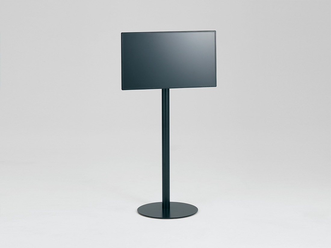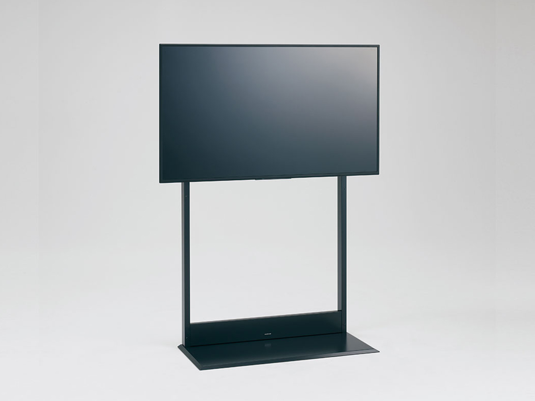 大型モニターやMAXHUBにも対応した壁寄せタイプのモニタースタンド。通路を邪魔しないスリムなベースは車いすの方も近づきやすく、バリアフリーにも配慮しています