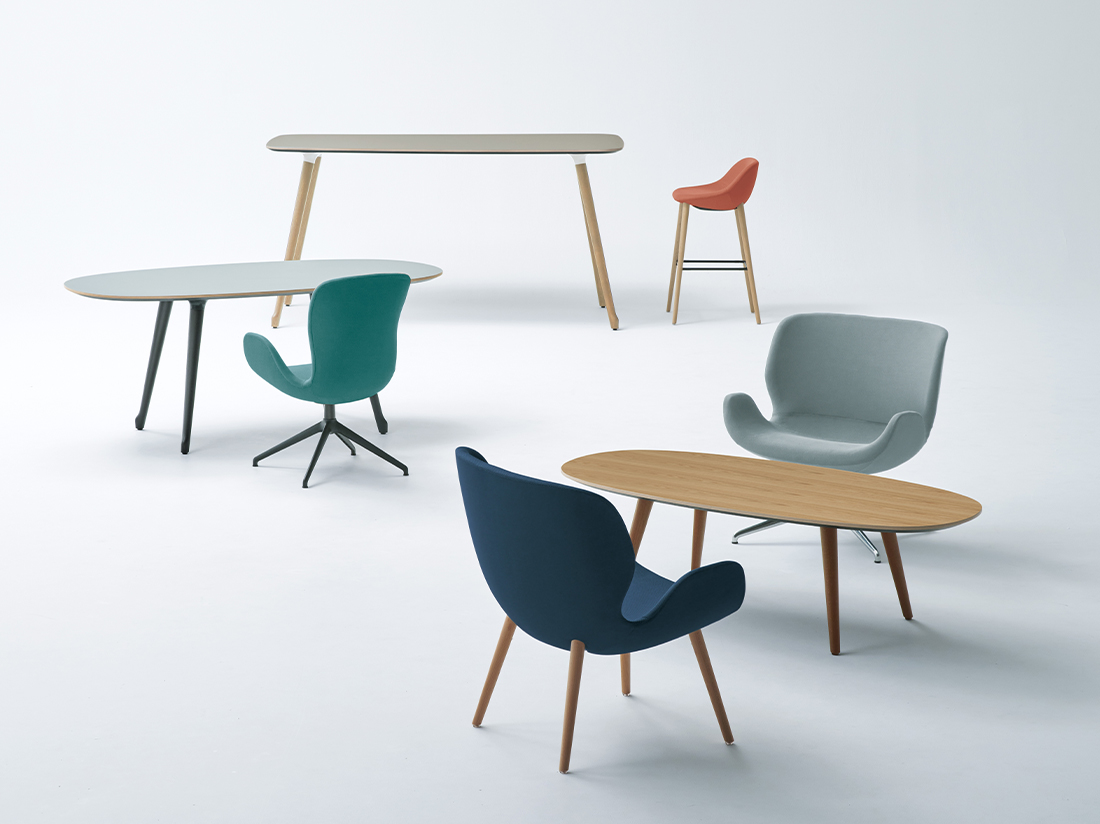 自然からインスピレーションを受けてデザインされたテーブルとチェアのコレクション。美しく柔らかな曲線を描いたフォルムがワークスペースの雰囲気を和らげ、より良いアイデアやコラボレーションが生まれる空間を実現します。