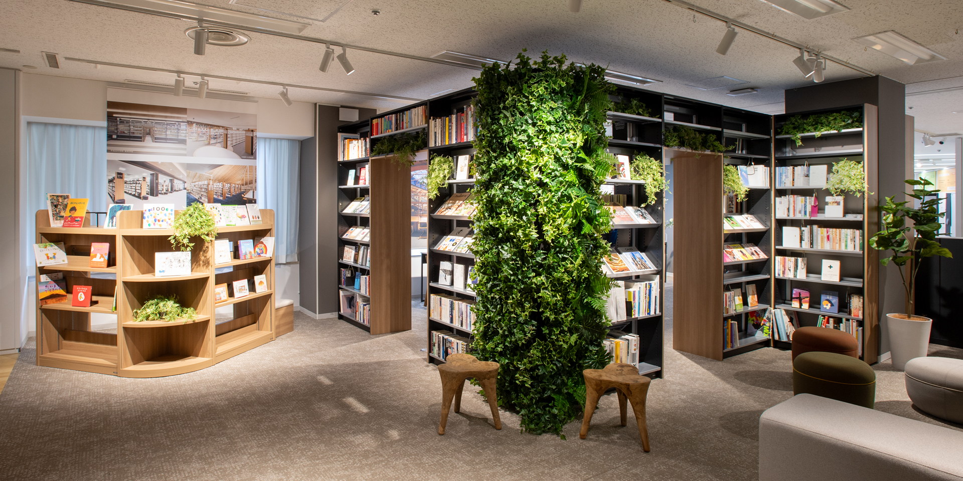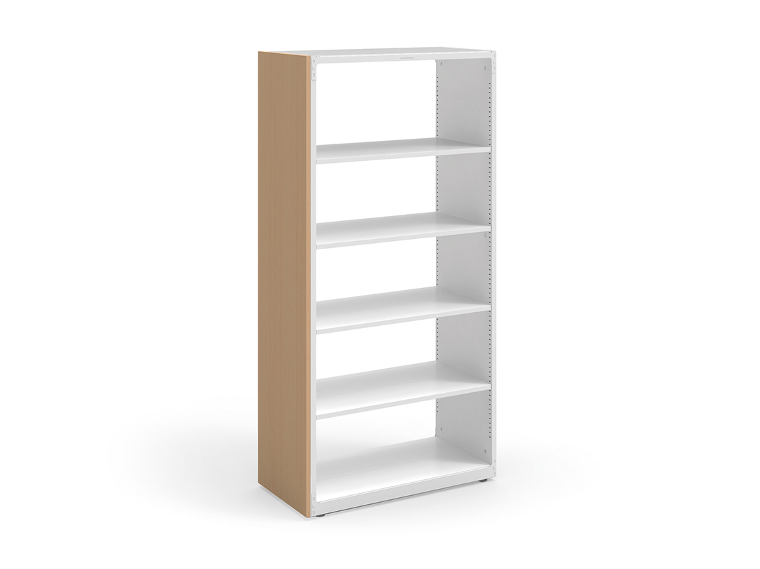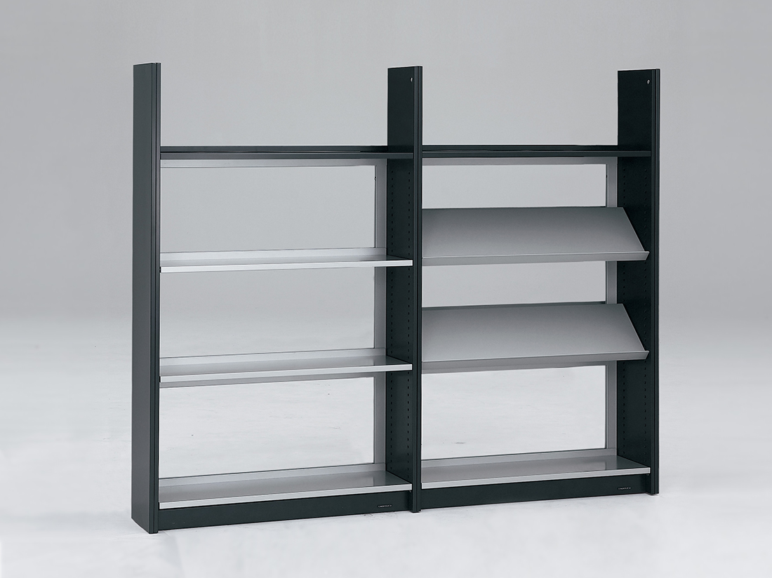 細部までデザインを追求したスチールパネル書架。背面パネルがなく、すっきりと見通しのよい空間を演出します。棚板は、向きを変えることで表紙見せへと変化し(スチールパネル書架では初)、側板のバリエーションも多彩です。