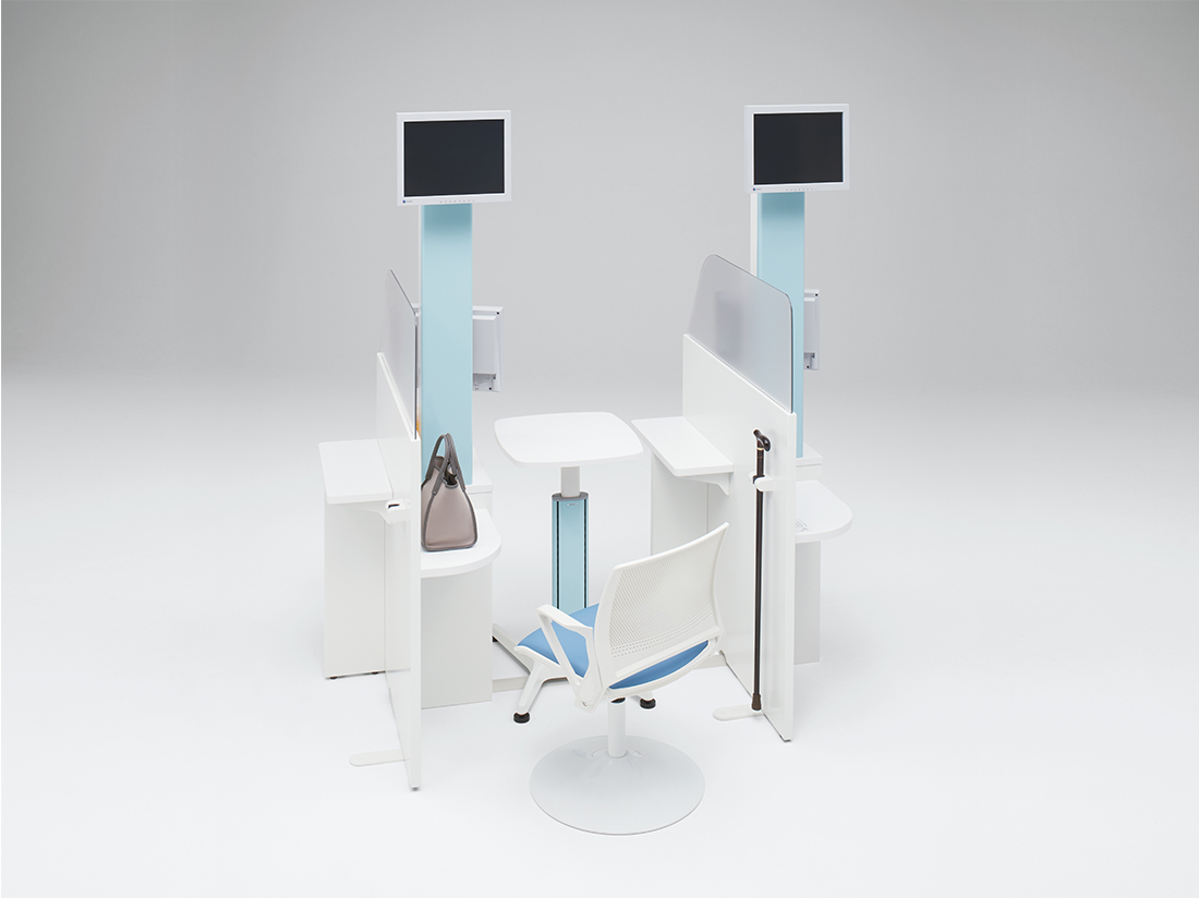 パーティション/荷物置き/採血備品収納/モニター設置・配線スペースなど、採血環境に必要な機能を集約・一体化した独立型ブース。スタッフの業務を効率化し、受診者にとって安全に採血を受けられる環境を提供します。