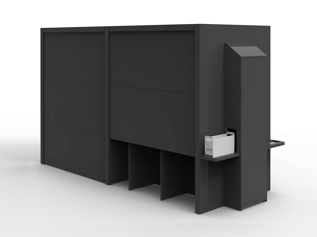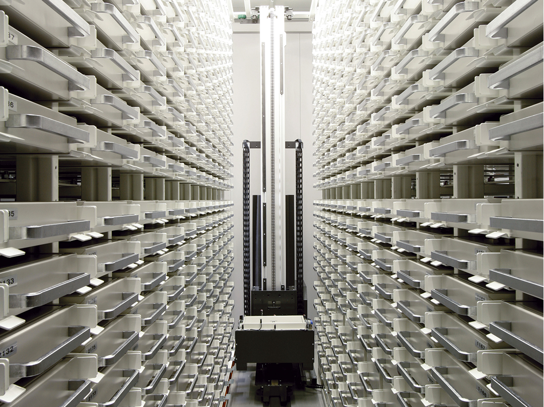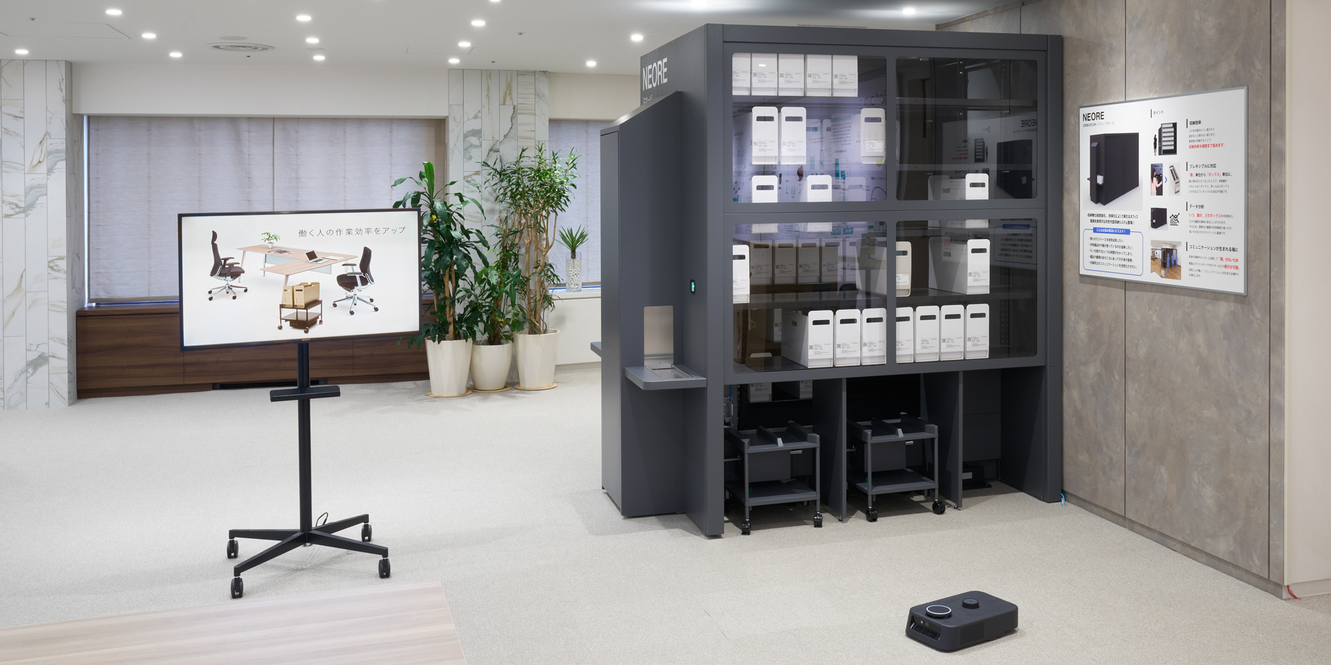 金融業界にとって、今や不可欠な貸金庫。省スペース&ローコストのオカムラ全自動貸金庫は、お客様がカードと暗証番号を入力することで、専用のブースに座ったまま、自動的に貸金庫ボックスが手元に搬送される最先端システムです。