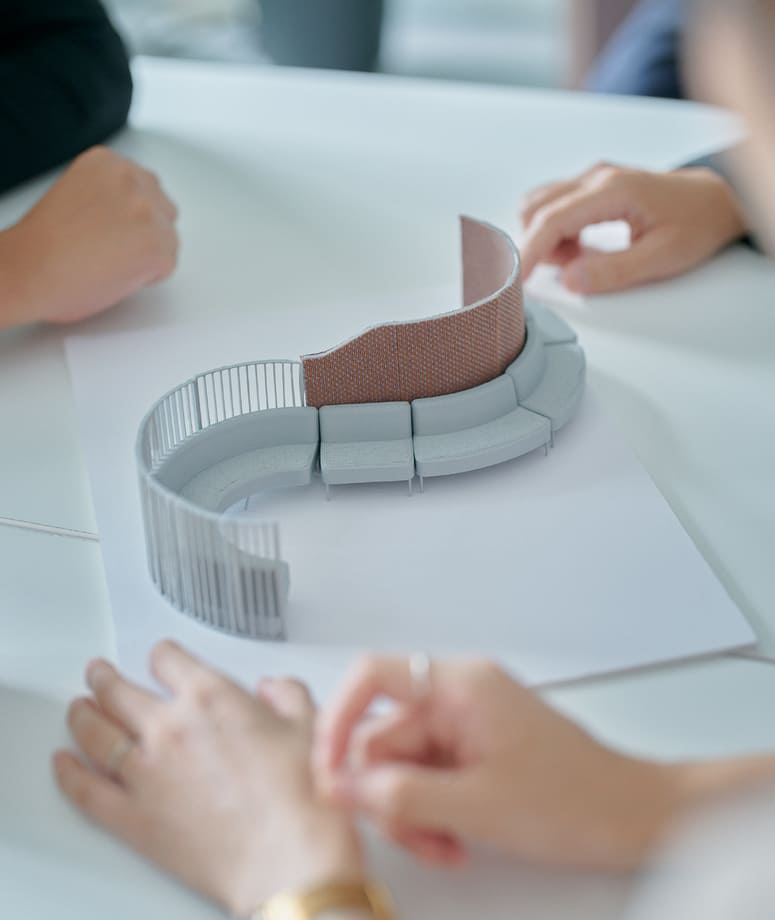 その次に、今のオフィスに馴染むパーティションデザインとは何なのかを真剣に考えていきました。曲線の重要性から3種類のRパネルを考え、閉塞感を生まないよう、抜け感のあるパネルも3種用意しました。限りなく薄く、流れるようにつながるパネルのトップキャップやエンドカバー。巾木がないシンプルなデザインとすることで、多様なオフィス空間に馴染み、周りの家具を引き立たせるような存在になったと思います。