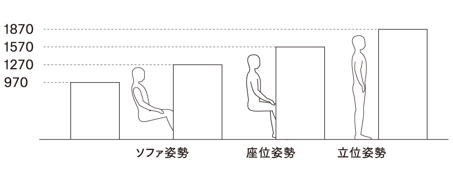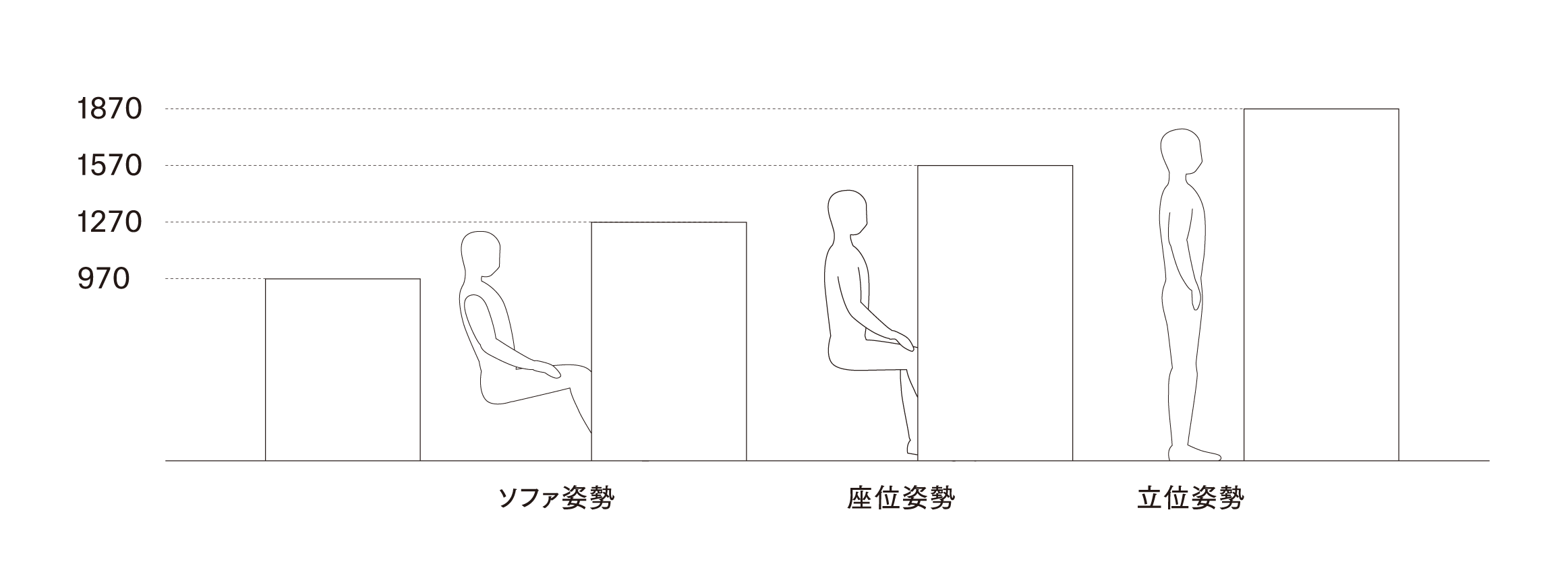 空間の奥行き感をつくる上で、高低差はとても大事です。オフィスのレイアウトはどうしても均質になりがちで、特に同じ高さのものが続くと空間の広がりが感じられにくくなるため、どれだけ高低差でリズムやズレを生み出していくかが重要になっていきます。YAAは4つの高さが自由に選べますし、単独で使うものではないので他の家具との高低差もつくりやすいです。特にオフィスの中で一番使われるデスクはある程度高さが決まっているため、そこをベースにしながら視界を遮らない1800~720mmくらいの間で何を置くかを考えると、バランスよく奥行き感や空間のおもしろさが広がっていくと思います。