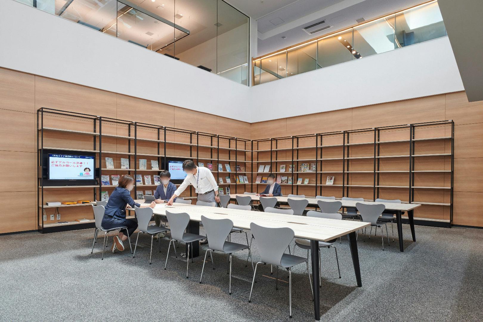 エントランスから階段で2階へ上がると、高い天井から光が差し込む吹き抜け空間が出現します。 ここで訪れた人々を迎え入れるのが、1つ目のアトリウム『ライブラリーエリア』。
