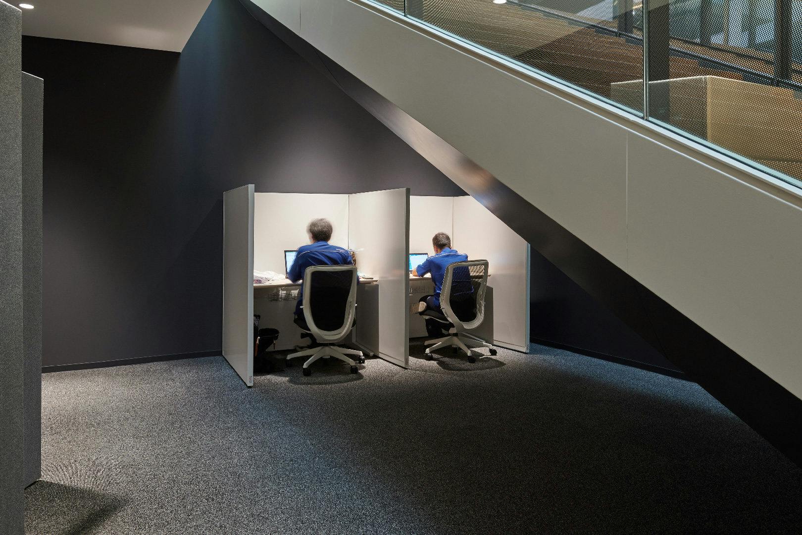 こちらは開発の支えとなる専門図書を閲覧できるだけでなく、他拠点で働く方々のタッチダウンスペースとしても利用できます。 ワークブースが設置されている階段下は、一人で集中して調べものをしたり作業をしたりできる、秘密基地のような空間です。