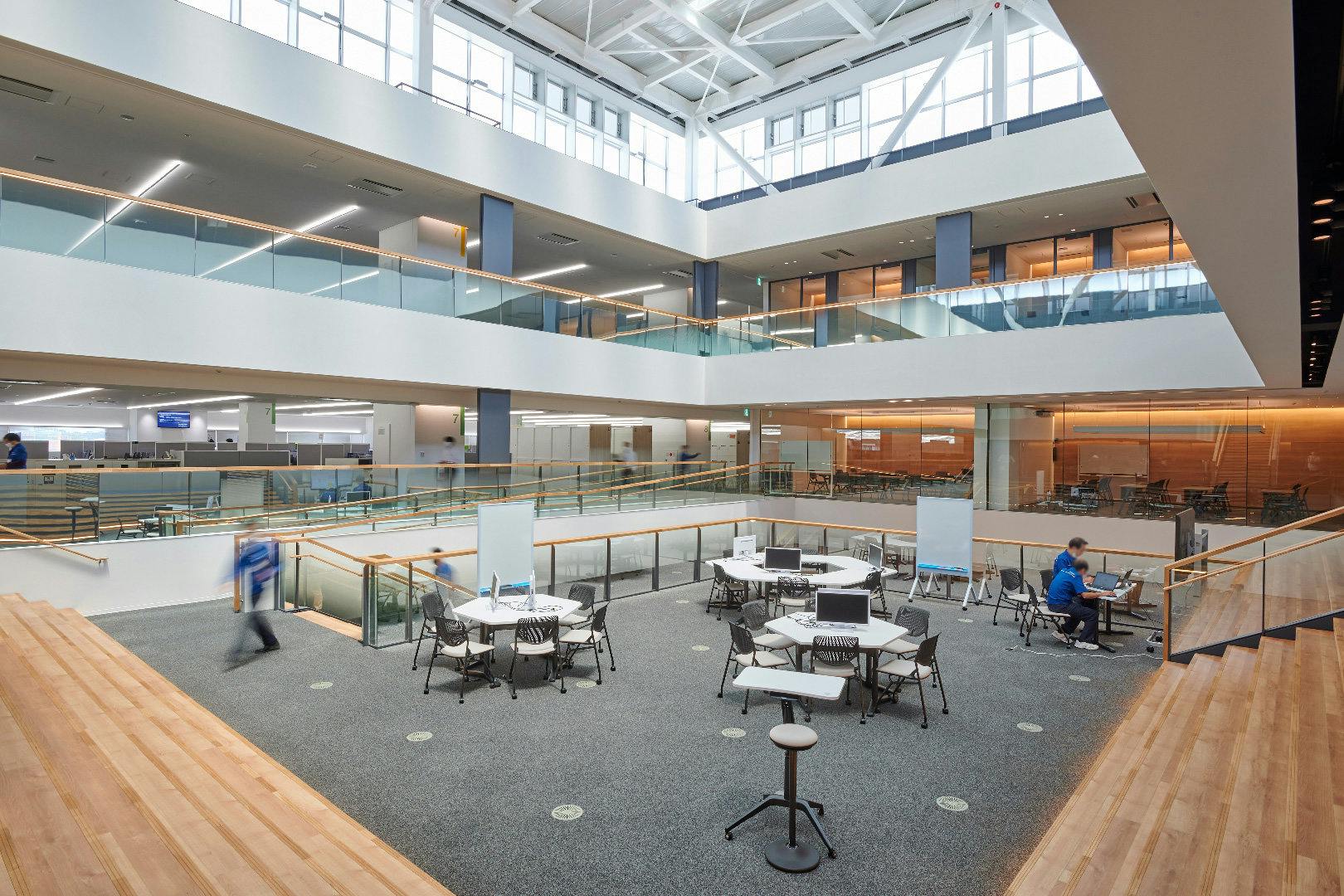 統合した部門間の交流については、中央の吹き抜けエリアに設けた4つのアトリウムとキャンティーン(食堂)で実現。 建物自体の構造を最大に活かし、風通しの良い交流エリアと集中ができる執務エリアにメリハリを持たせるよう意識しました。