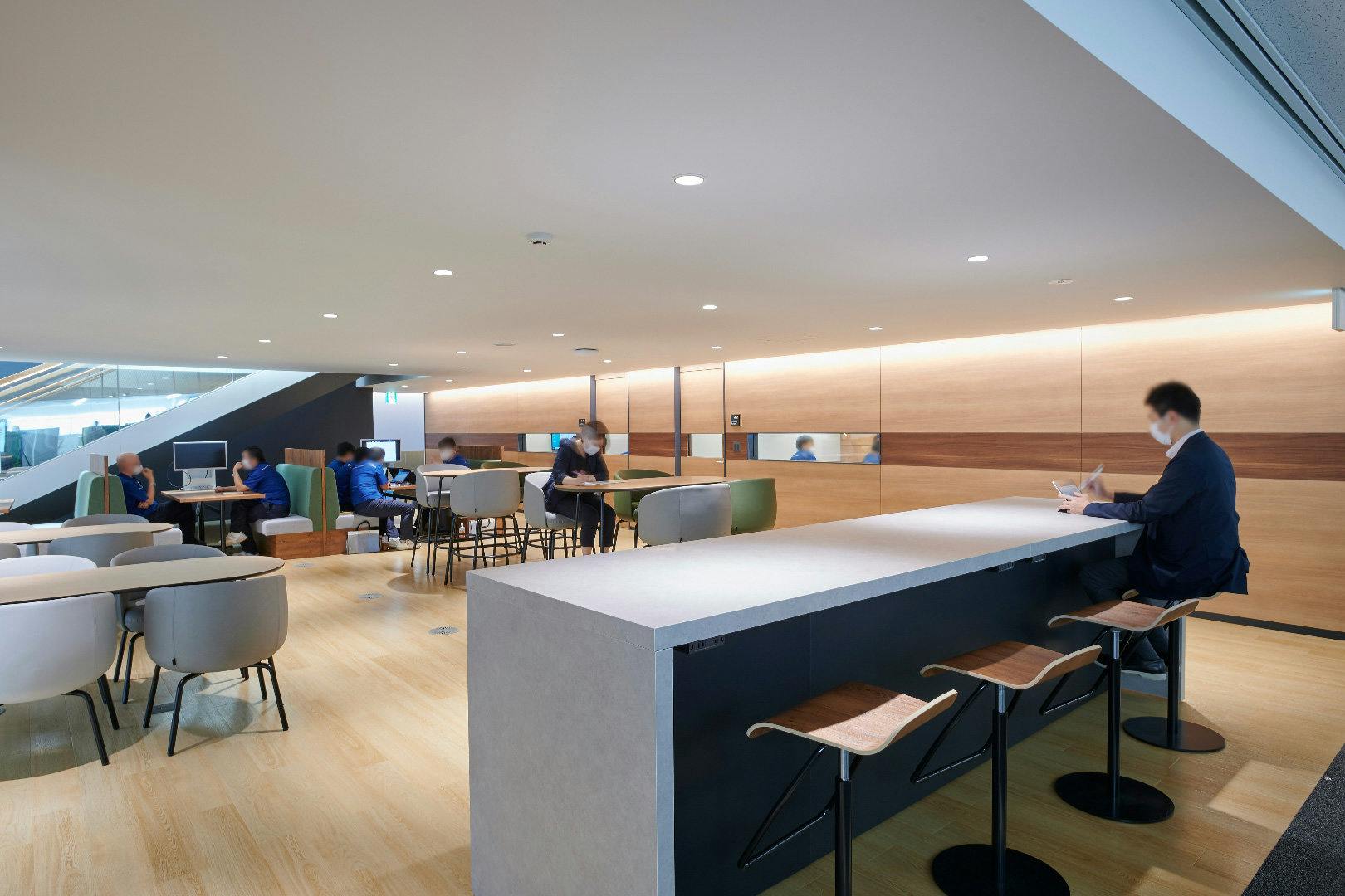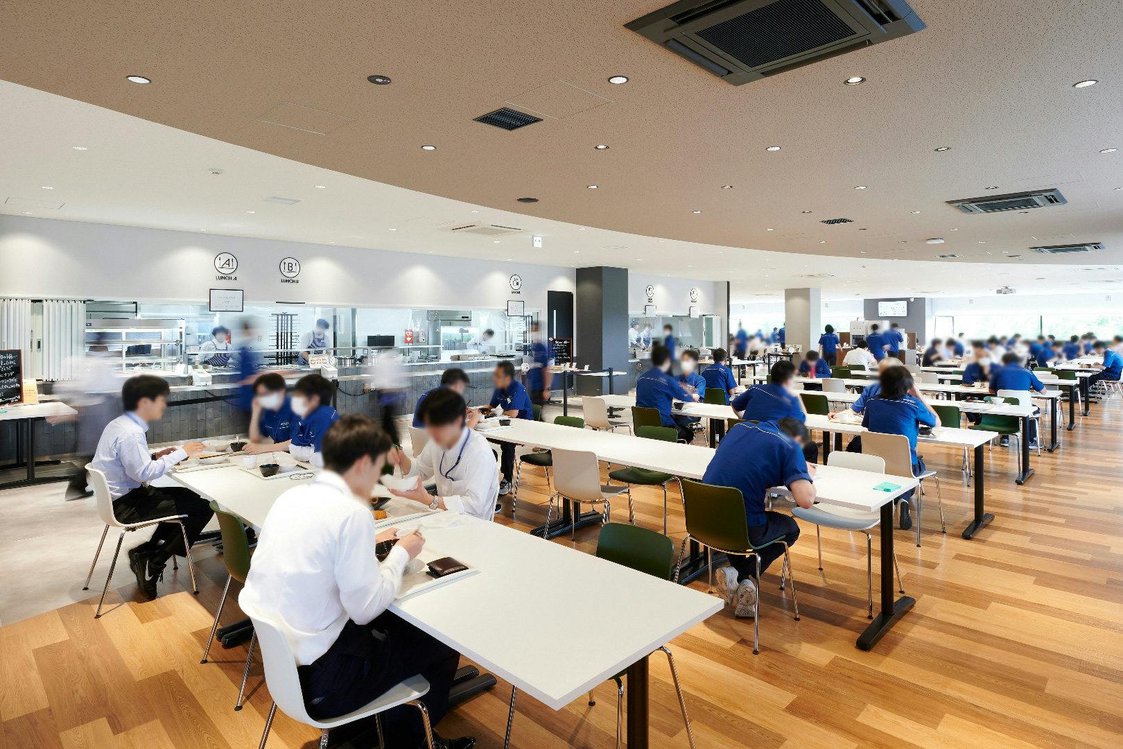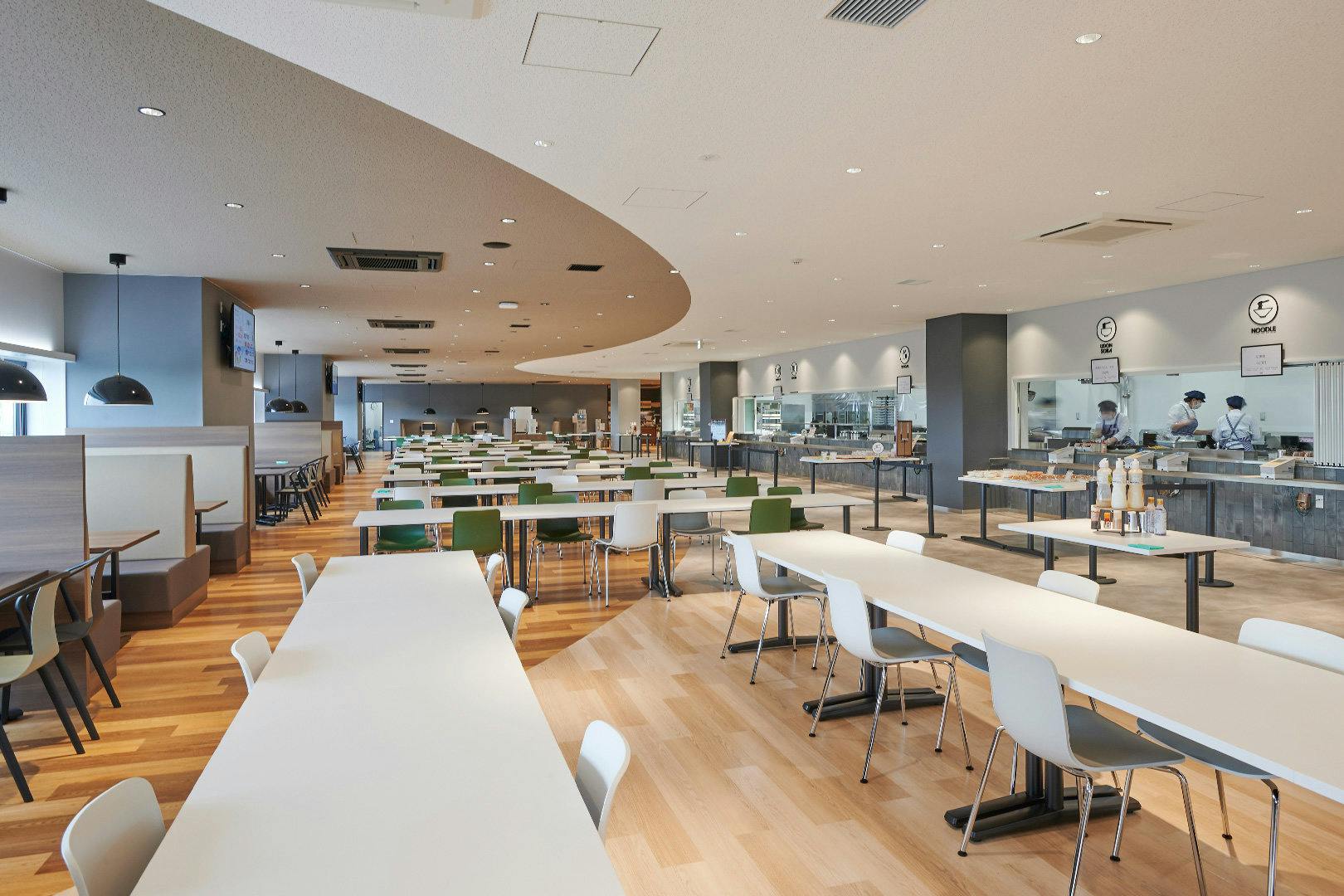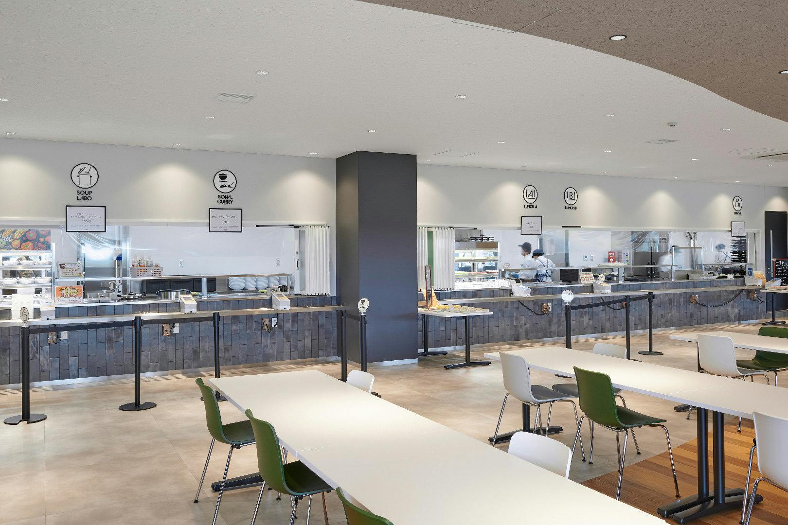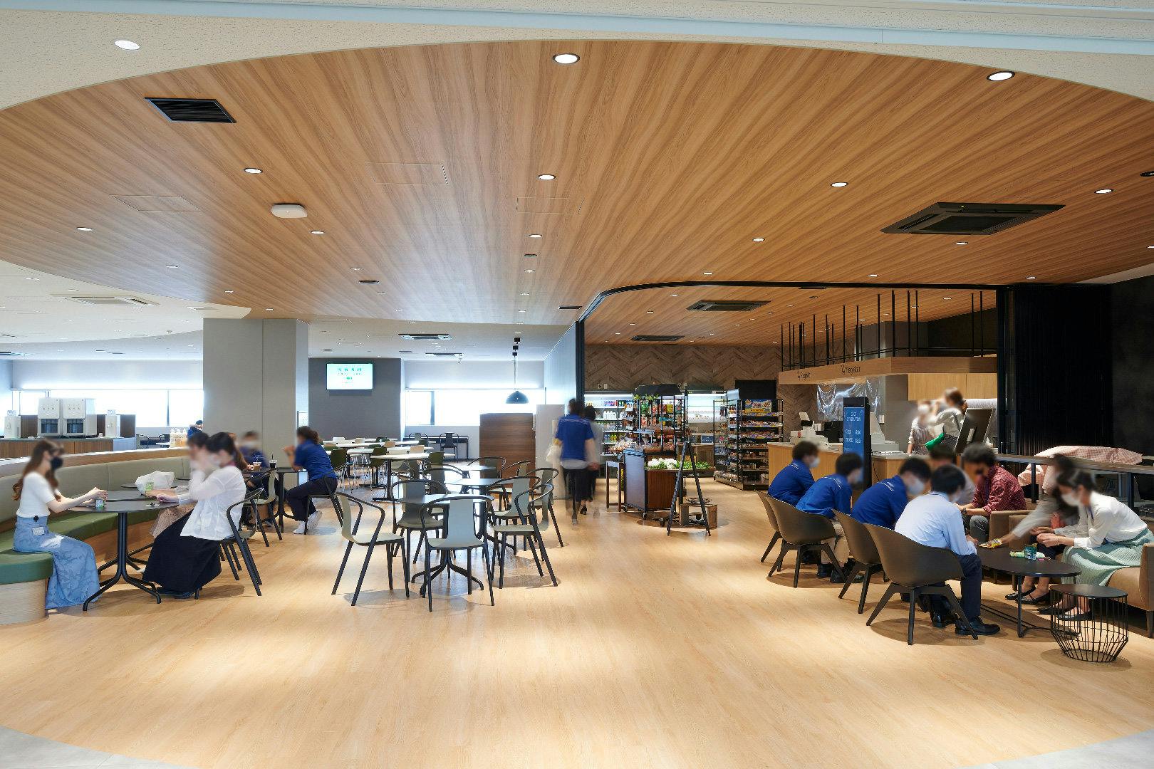コミュニケーションの中心となるキャンティーン(食堂)には、正午になると続々と社員の方が集まってきます。 多くの人が集まる空間だからこそ、利用者が安心できる機能的な配慮も。 床と天井の素材をエリアによって変えることで、注文に並ぶ人とテーブルで食事をとる人の動線を自然と分けることができます。 座席は前後左右と間隔を空けた千鳥配置とすることで、感染リスクを低減しています。