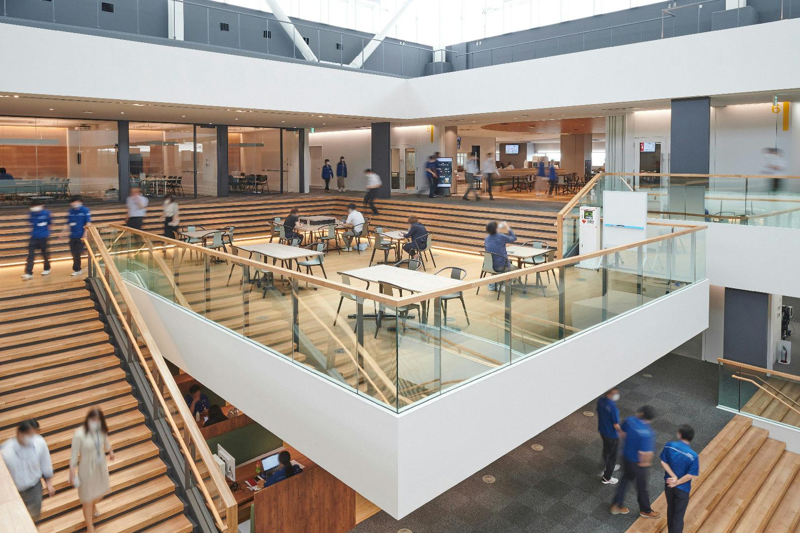 2階のアトリウムから中階段で3階に上がると、今日もいよいよ業務スタート。 右手に執務フロア、左手には研究開発室、そして中央には人々が交わる2つのアトリウムがあります。