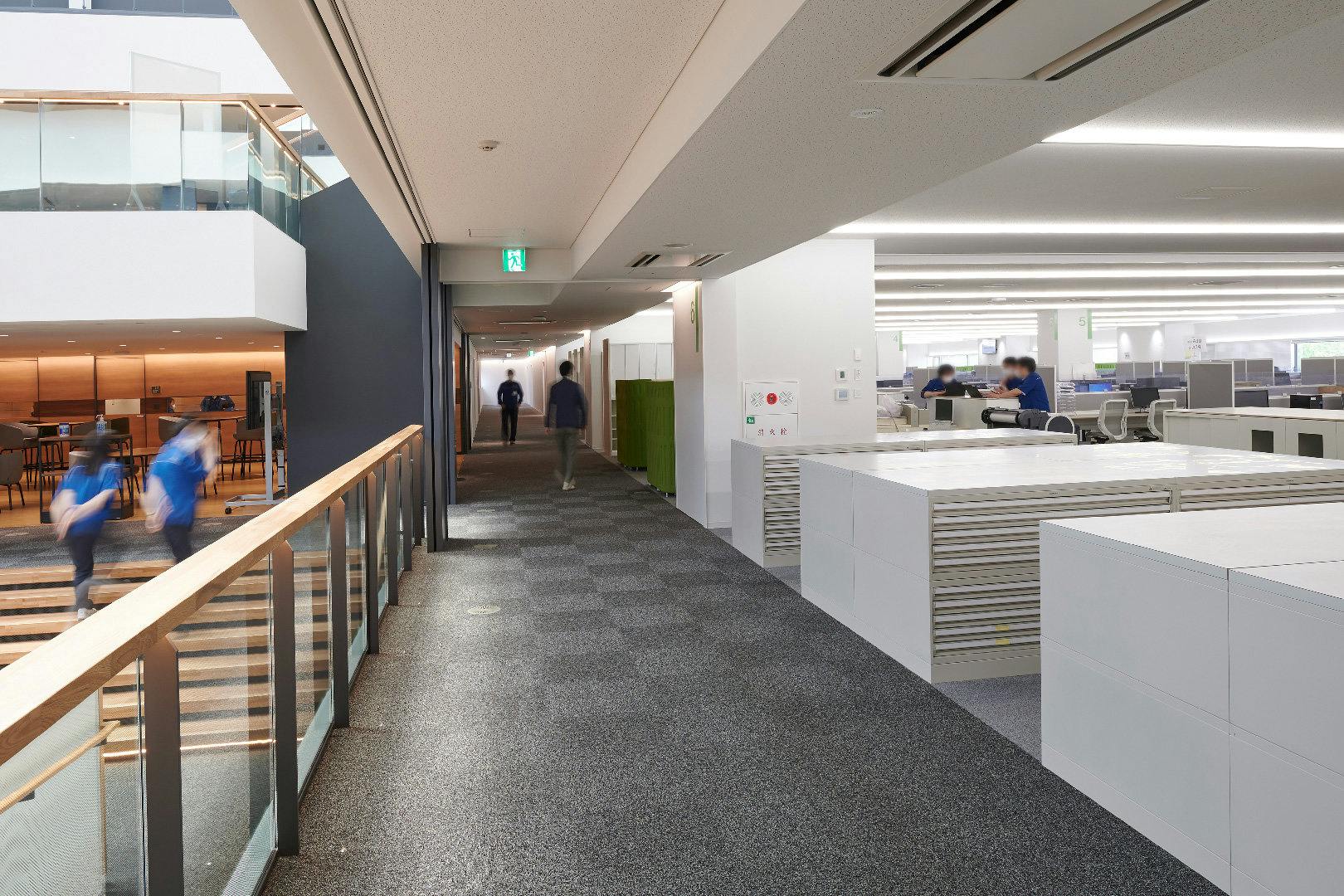 アトリウムの両側には執務エリアが広がっています。 壁はなく、通路で空間が区切られているので、自然な人の流れが生まれています。 通路側に集約した図面キャビネットを利用して、突然立ち会議が始まることも。