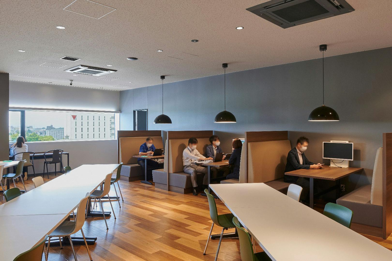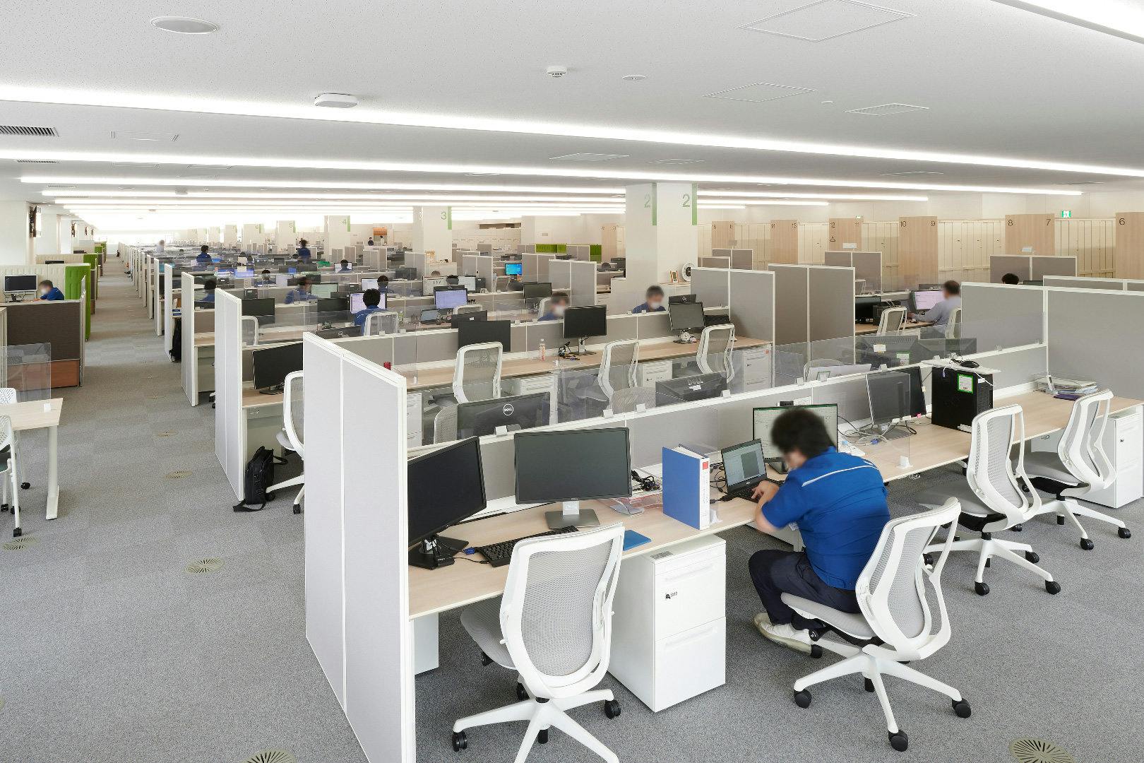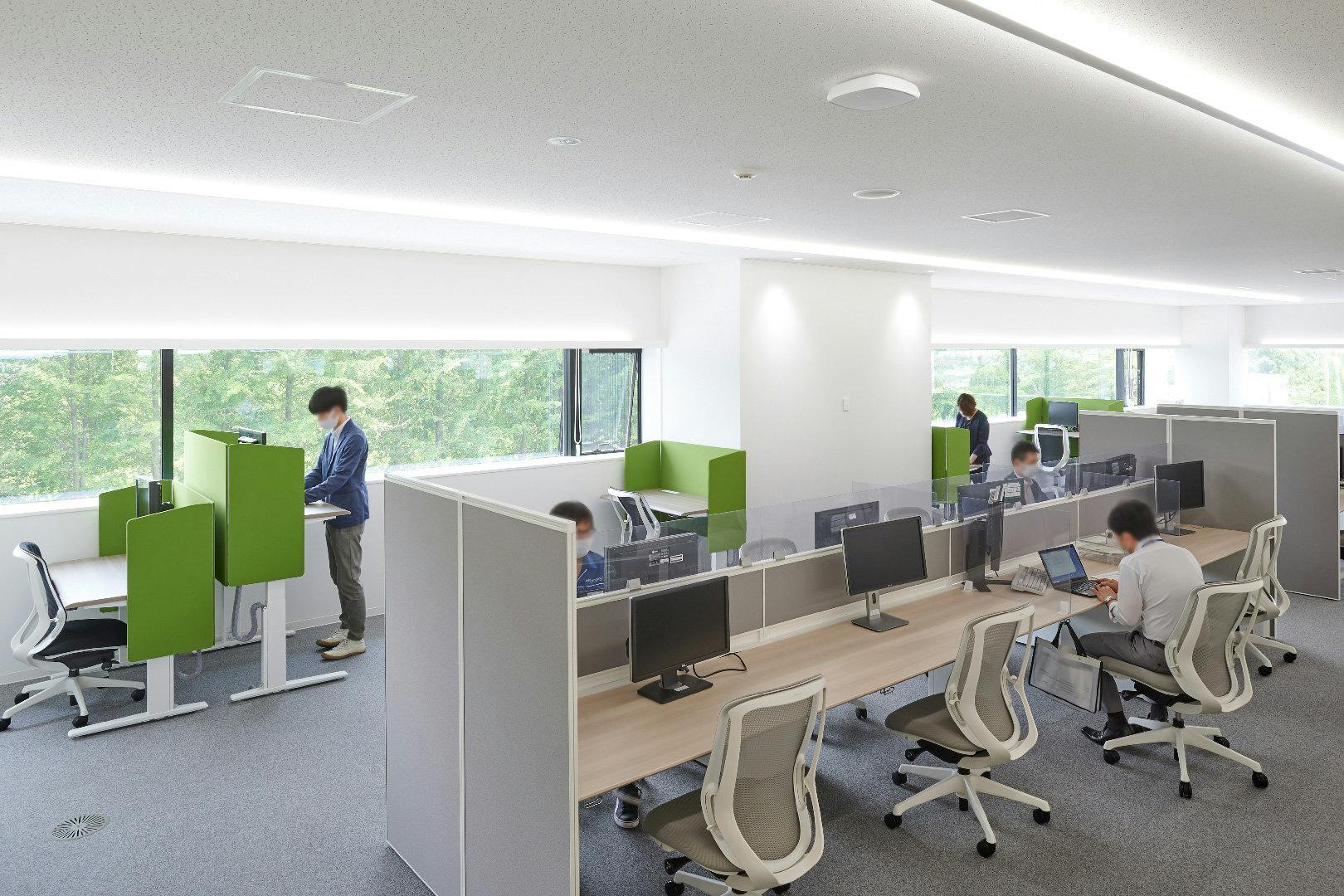 プロジェクト当初は、1200名を全席固定席で収容する計画でしたが、新型コロナウイルスの流行を受け、感染対策として一部フリーアドレスを導入した人員の75%の座席数へとプランを変更しました。 窓際には自由に使える上下昇降デスクやミーティングブースを設置するなど、ABWの要素も取り入れられています。