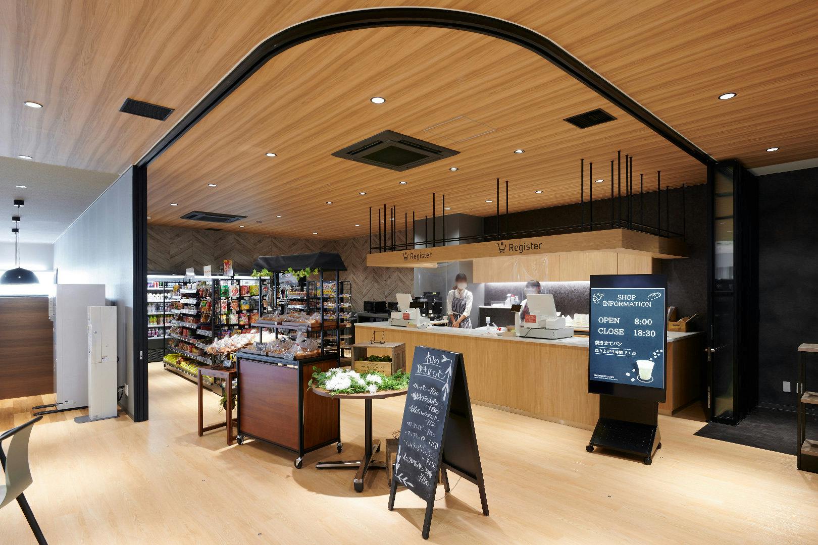 キャンティーン(食堂)の入り口付近にある売店は、心地よい雰囲気だけでなく、使いやすさにもこだわっています。 カウンターは電子機器の配置や店員の使い勝手を反映できるオーダーメイドの造作家具。 商品棚は、街中の店舗でもよく使われるオカムラの商環境什器から選定しました。