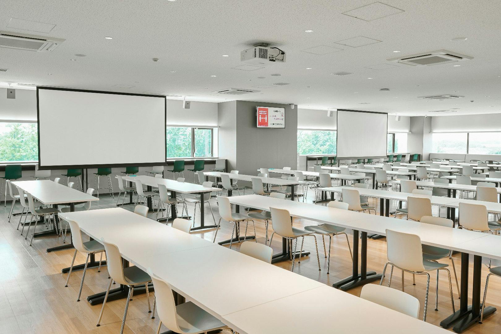 昼食時間帯以外は、個人作業や打ち合わせにも利用することができます。 奥の広いスペースには大きなスクリーンを二面設置。 大人数での会議や、発表会、セミナーといった用途にも対応可能です。