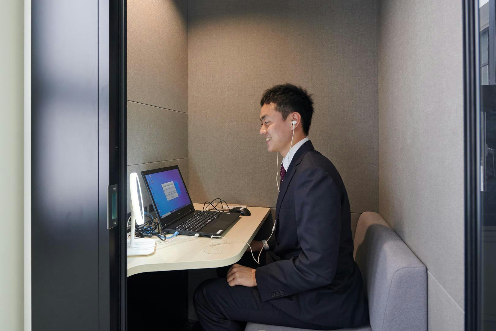ちょうど直近でオンライン選考を控えていたので、予約を入れて利用してみると、想像以上に使い心地が良かったです。 自室には机がないという話もしましたが、自宅が道路に面しているので、面接中に周囲の環境音が入ってしまうことも非常に気になっていたのです。 扉を閉めるとブース内は非常に静かなので、集中して選考に臨むことができました。