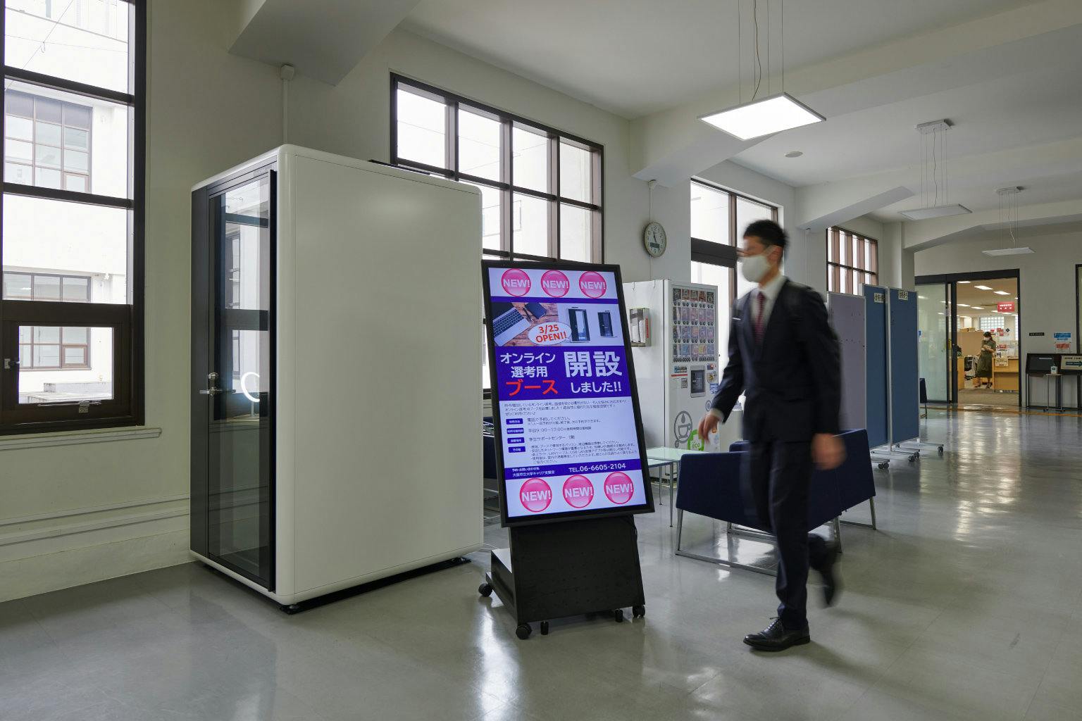 私がブースの存在を知ったのは、用事を済ませるために学生サポートセンターに訪れた際でした。 入口を入ってすぐのメイン通路に、これまでなかった大きなボックスが設置されていたので、「これはなんだ?」と。 サイネージの表示を見ると「オンライン選考用ブース」と書かれていたので、気になってすぐにキャリア支援室に話を聞きにいきました。