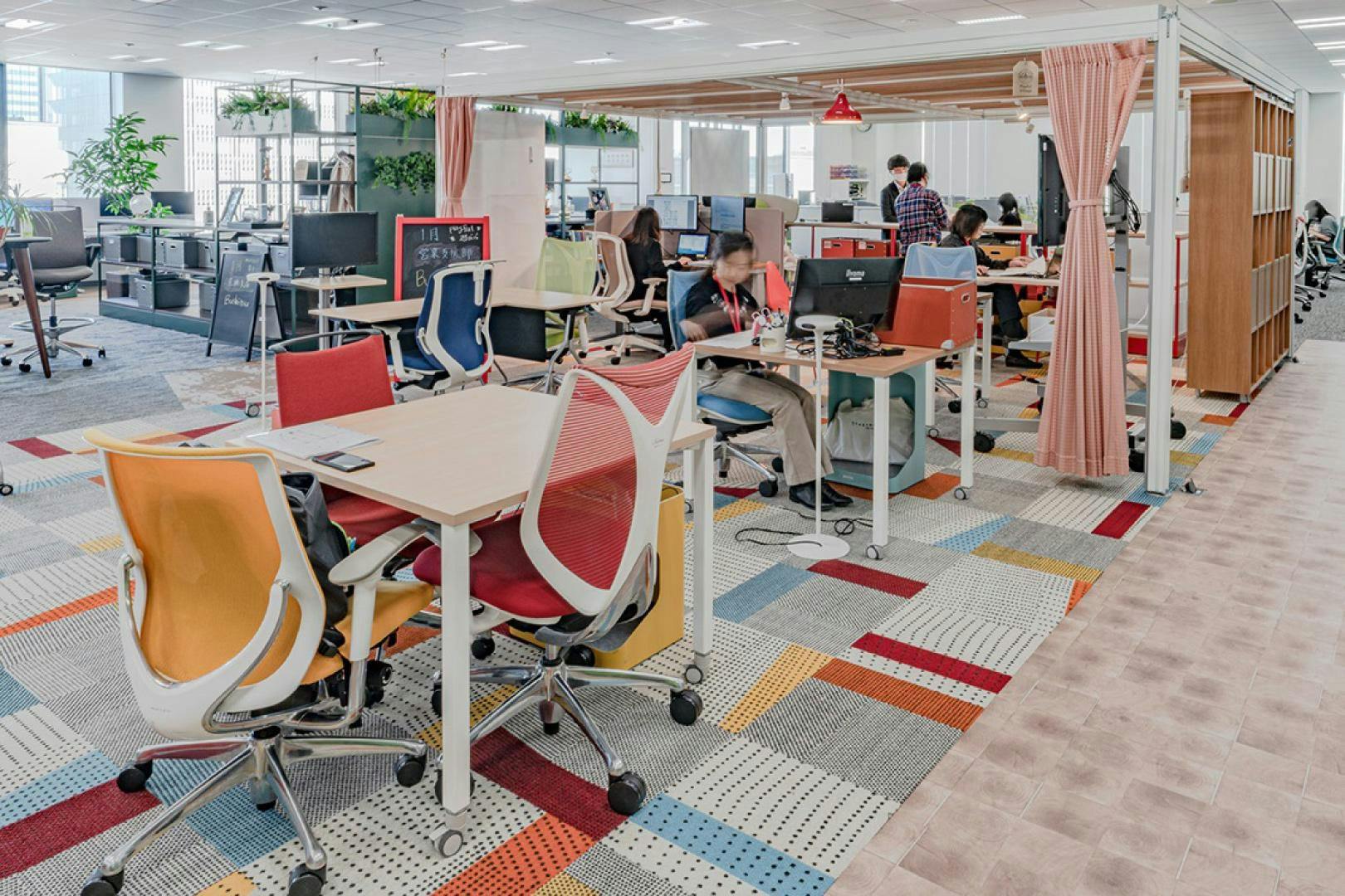 CO-RiZ LABOではグループアドレス※を主軸としながら、目的に応じて働く場所を選べるABWを取り入れています。 また、チームの連携を強化するために各部門に1室ずつ、チームの拠り所となる『部室』を用意しています。 しかし、同拠点では部門間の交流や情報共有を活発化するために、完全な個室ではなくオープンシェルフやカーテンなどで空間を仕切る「オープン部室」を採用。 また、月に一度利用する部室をローテーションで入れ替え、時間帯によってはフリーアドレス席として誰でも使用できるようにするなど、運用面で工夫をこらして交流を促進しています。 これはチーム内での交流を意識するあまり、部門が閉鎖的になってしまった過去の失敗経験から生まれた、新たな取り組みのひとつです。