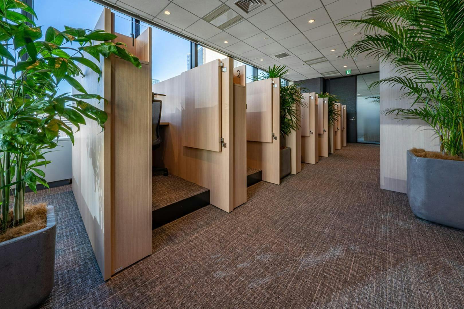 CO-RiZ LABOは、個人の能力を最大限に引き出す環境も兼ね備えています。 他拠点の社員も働くサテライトエリアと執務エリアの間に設けられた『スイッチラボ』は、集中力を高めるためにあらゆる工夫が施された究極の超集中空間。 “共創”を生み出すために重要な“独創”を行う場として、「神社のアプローチ」を再現した集中へのモード切り替えを促す仕掛けが盛り込まれています。 その他にも、集中に特化したアロマ、不特定多数にマッチする自然環境音、最適な量に設計された生の植物、集中に最も効果的な寸法で製作されたブースなど、すべてが計算された「超集中」の場となっています。
