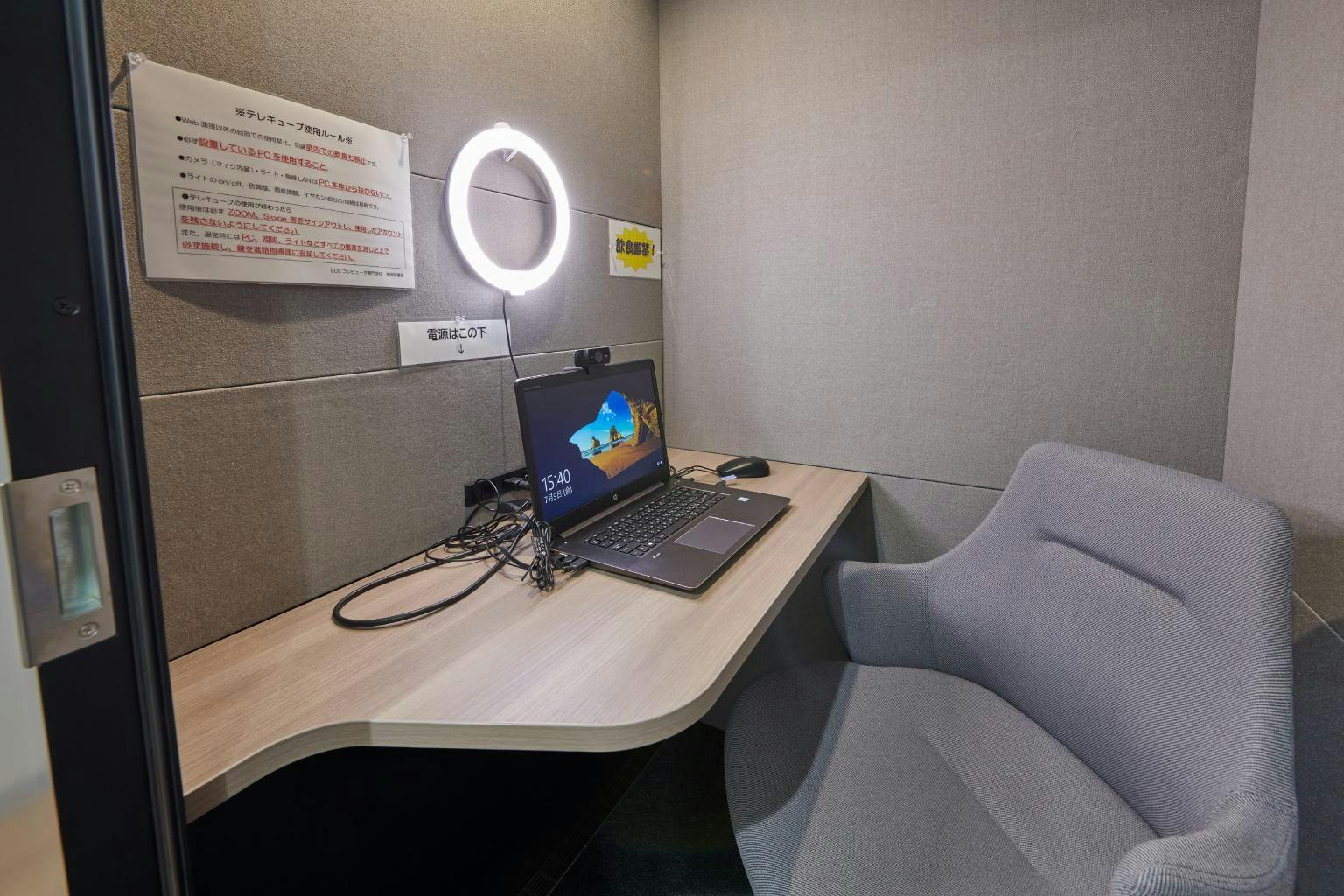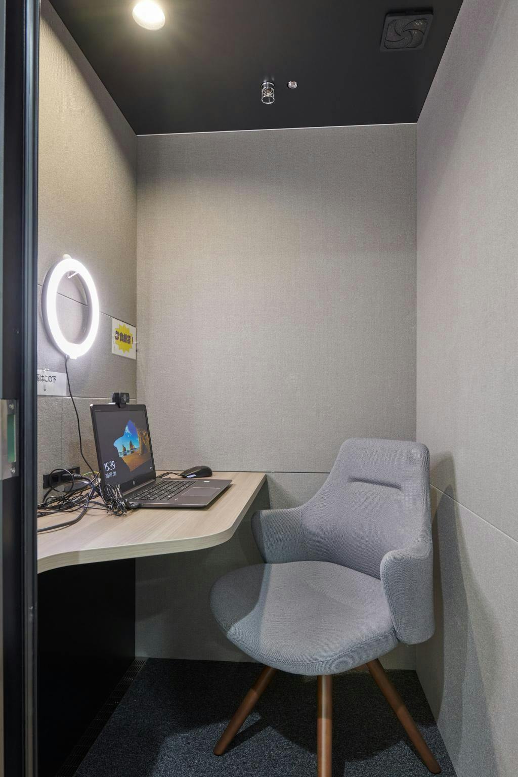 ブースの導入にあたってPCやカメラ、ライトもすべて用意したので、学生は自分のIDひとつでオンライン選考に参加できます。 画面からの距離や学生の動きやすさにもこだわって、椅子も通常のソファではなく回転式のチェアに変えてもらいました。
