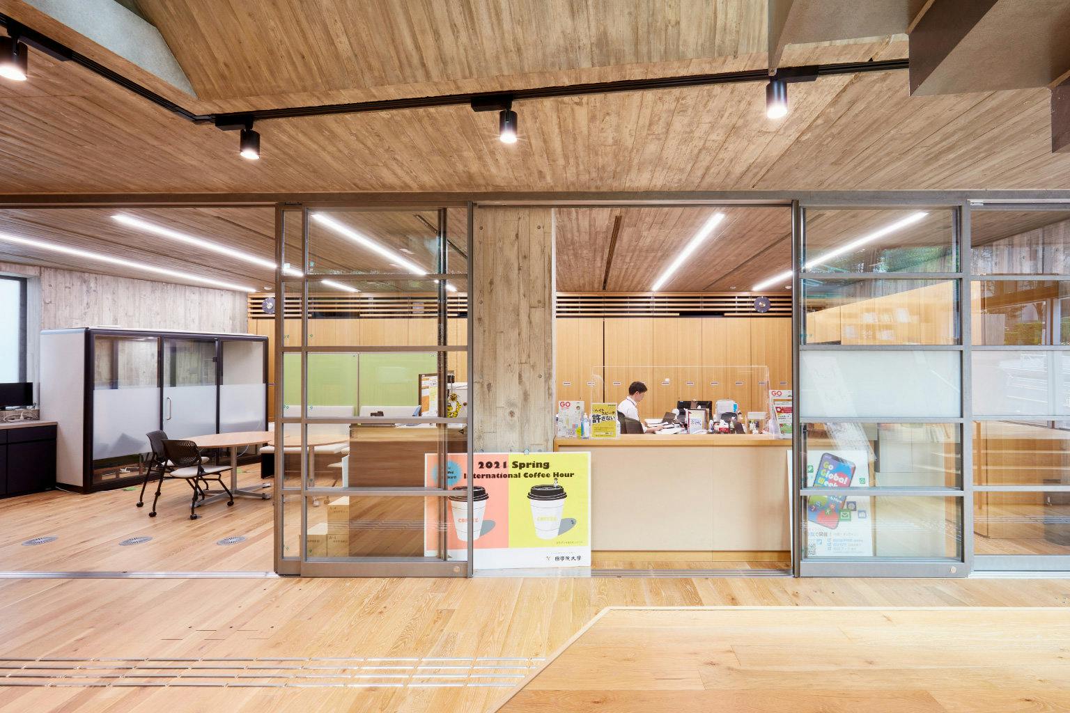 現在は対面授業、完全オンライン、ハイブリットなど、様々な形態を使い分けて授業を行っているため、一時期と比較すると学生がキャンパスに来ることも増えました。 総合学修館では地域住民や外部の方が参加可能な授業も行われるので、人々の出入りが多い日もあります。 建物も全面ガラス張りで事務所スペースもオープンな空間なので、我々も日々、開放感と緊張感を併せもって業務ができていると思います。