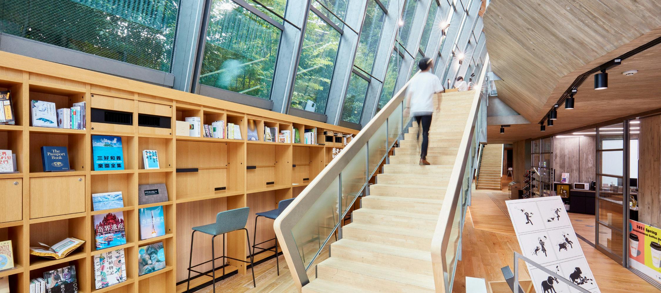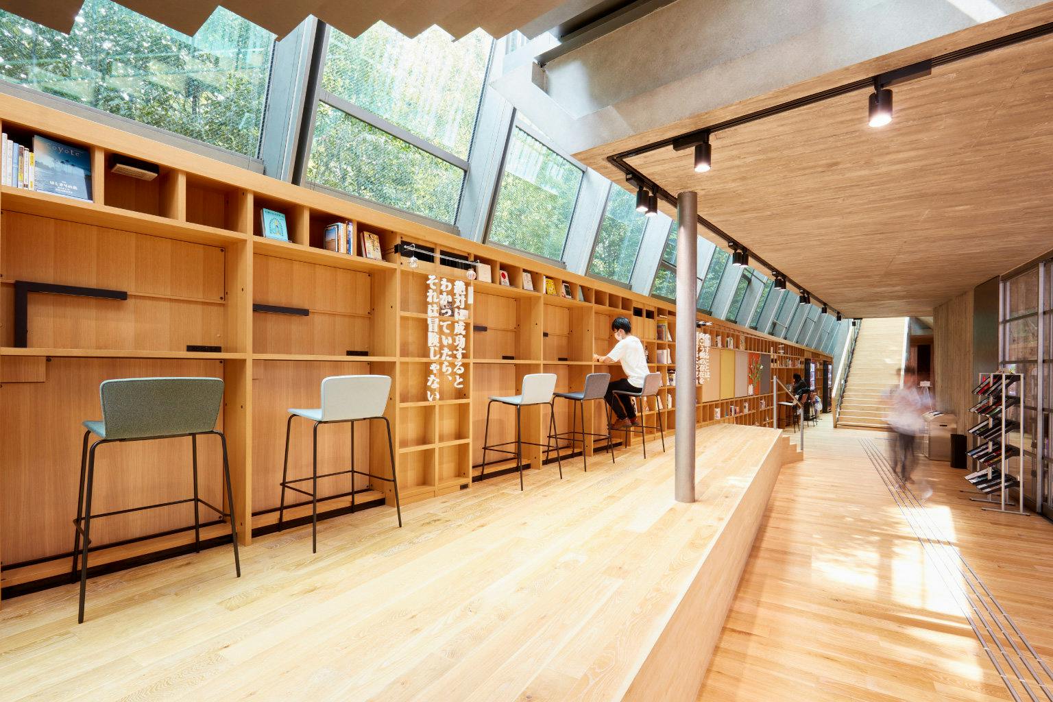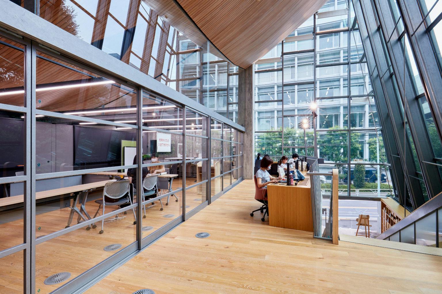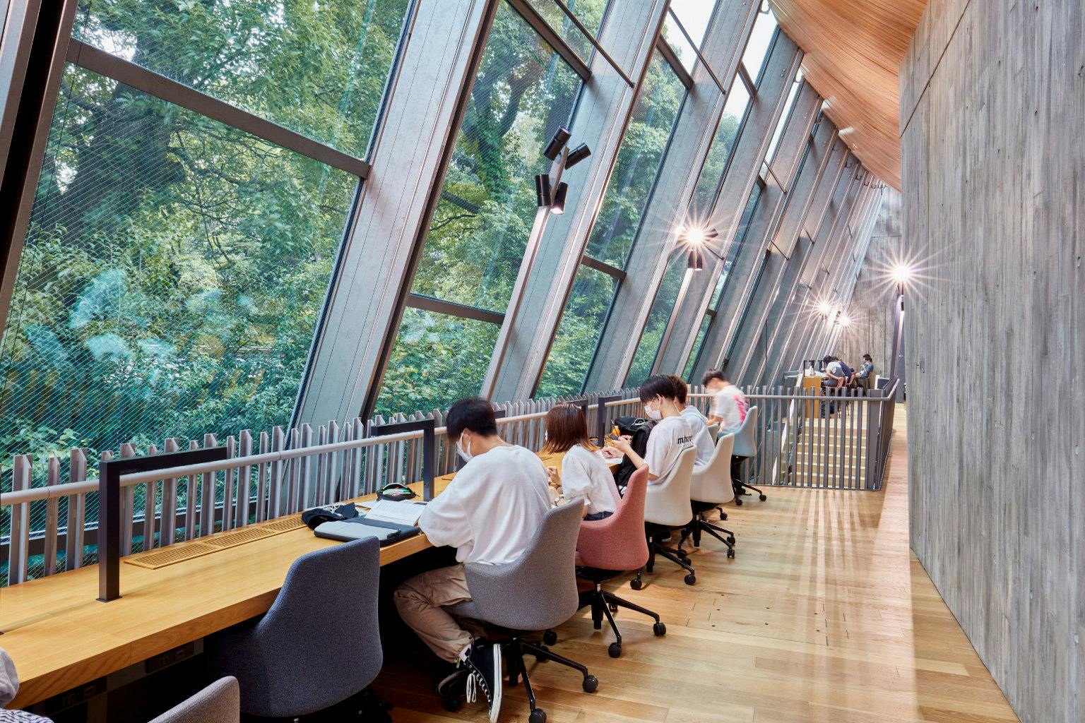 そんな國學院大學渋谷キャンパスに2019年に竣工した総合学修館(6号館)は、学生や留学生が快適に学修・交流できる場としても活用されています。 歴史ある神社と閑静な住宅街の狭間に建つ「離れ」のようなこの建物は、学生が個人学習に集中できる一方で、人々が絶え間なく入れ替わり交流を行える空間となっています。