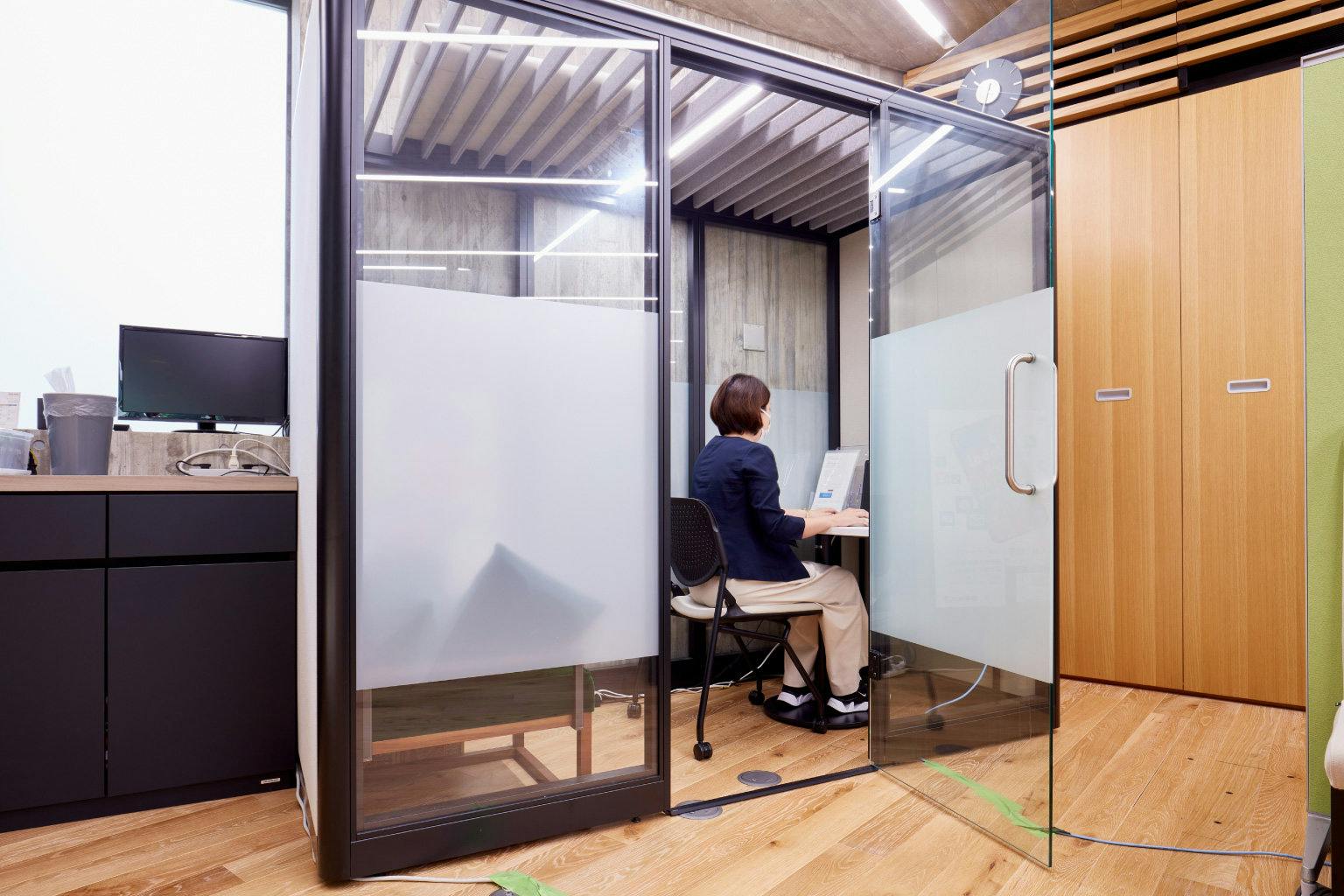 また、導入時は全面クリアガラスのままでしたが、プライバシーを考慮して目線の位置にはスモークのシートを張りました。 中に人がいるかどうかの透明性は確保しつつ、より集中空間としての機能を向上させるための工夫です。