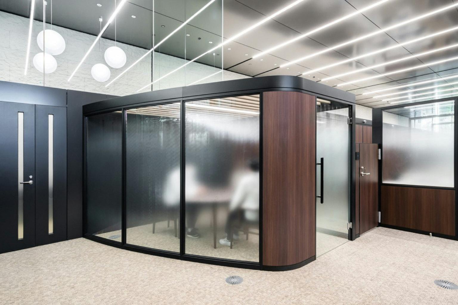 エントランスの右手には、遠隔相談ブースを設置。 専門性の高いサービスを幅広く提供するため、ひとりひとりのニーズに細かく対応した空間構成となっています。