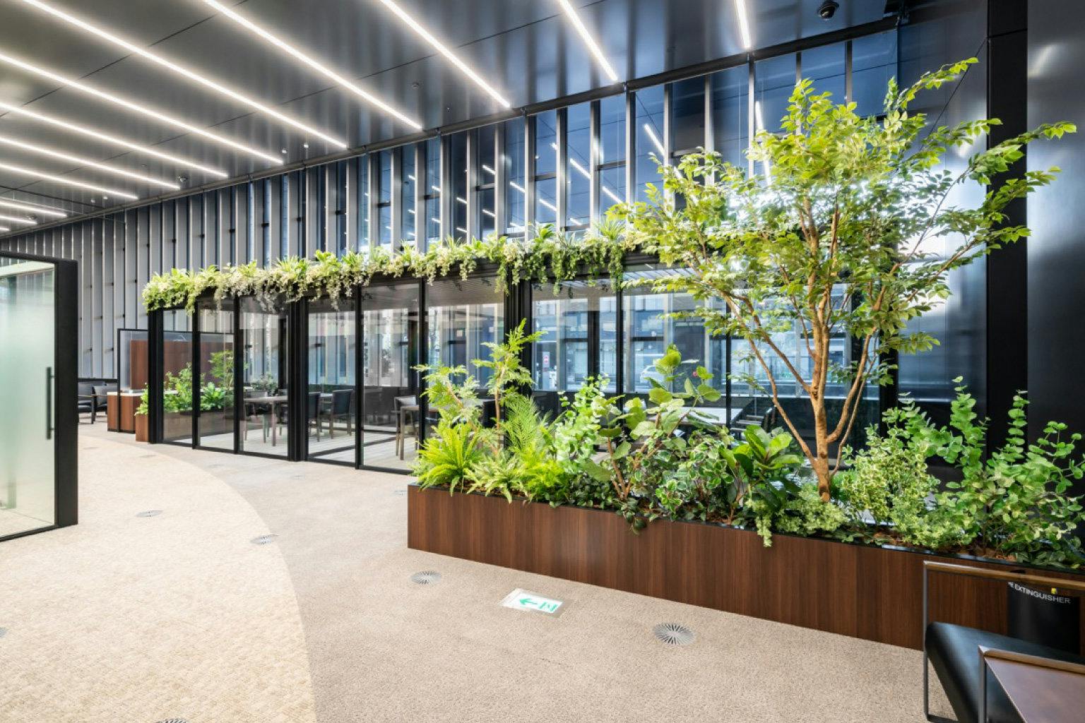 地域と共存するため、建物全体でサステナビリティへの貢献にも取り組んでいます。 外構には「武蔵野」在来の樹木や秩父の自然石などが使用されており、「武蔵野の森」と名付けられています。 外構の植栽は地域の生態系に配慮したものとしており、生物多様性を高める事業を評価する認証制度「JHEP(ジェイヘップ)」認証を、金融機関の本店として初めて取得しました。 本店内のいたるところにも癒しのグリーンがあらわれ、建物の内と外をつなぐ重要な役割を果たしています。