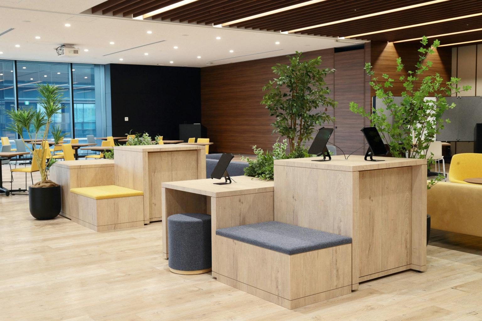 タブレット用の家具は、モジュールを統一したブロック型の造作家具で設計。 自由に組み換えができ、立ったり座ったりグリーンを配置したり、利用者も管理者も気ままにポジションを変えることができます。