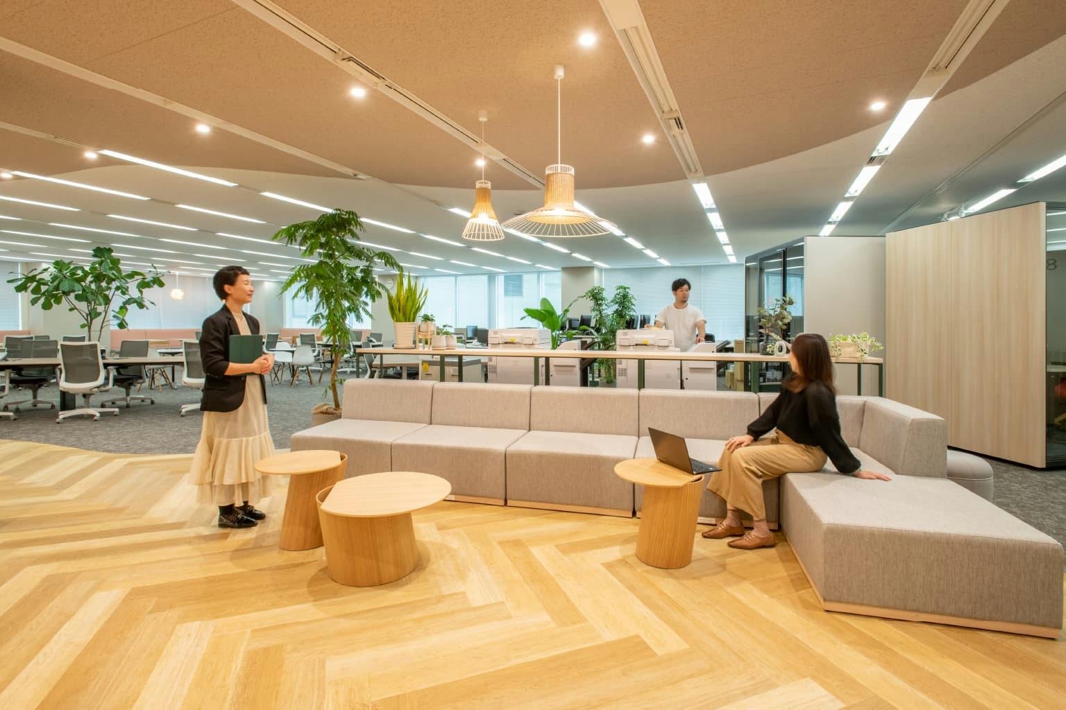 オフィスに入ると、木のぬくもりとあたたかみのあるソファスペースが出迎えてくれます。 ここは人と人とが交わりやすい出会いの場。 社員同士が一緒に出かけるときの待ち合わせポイントや、ちょっとした来訪者対応ができる空間です。