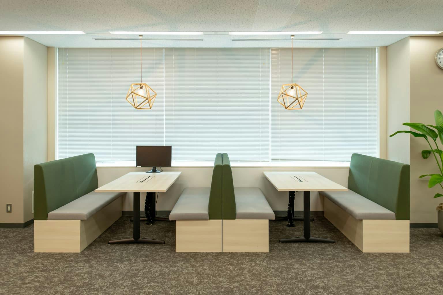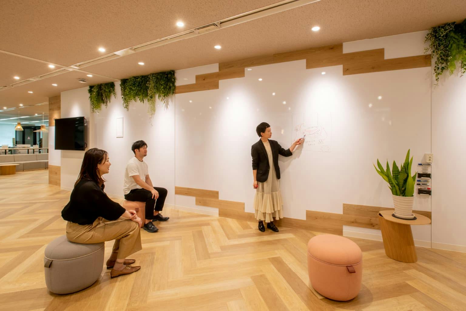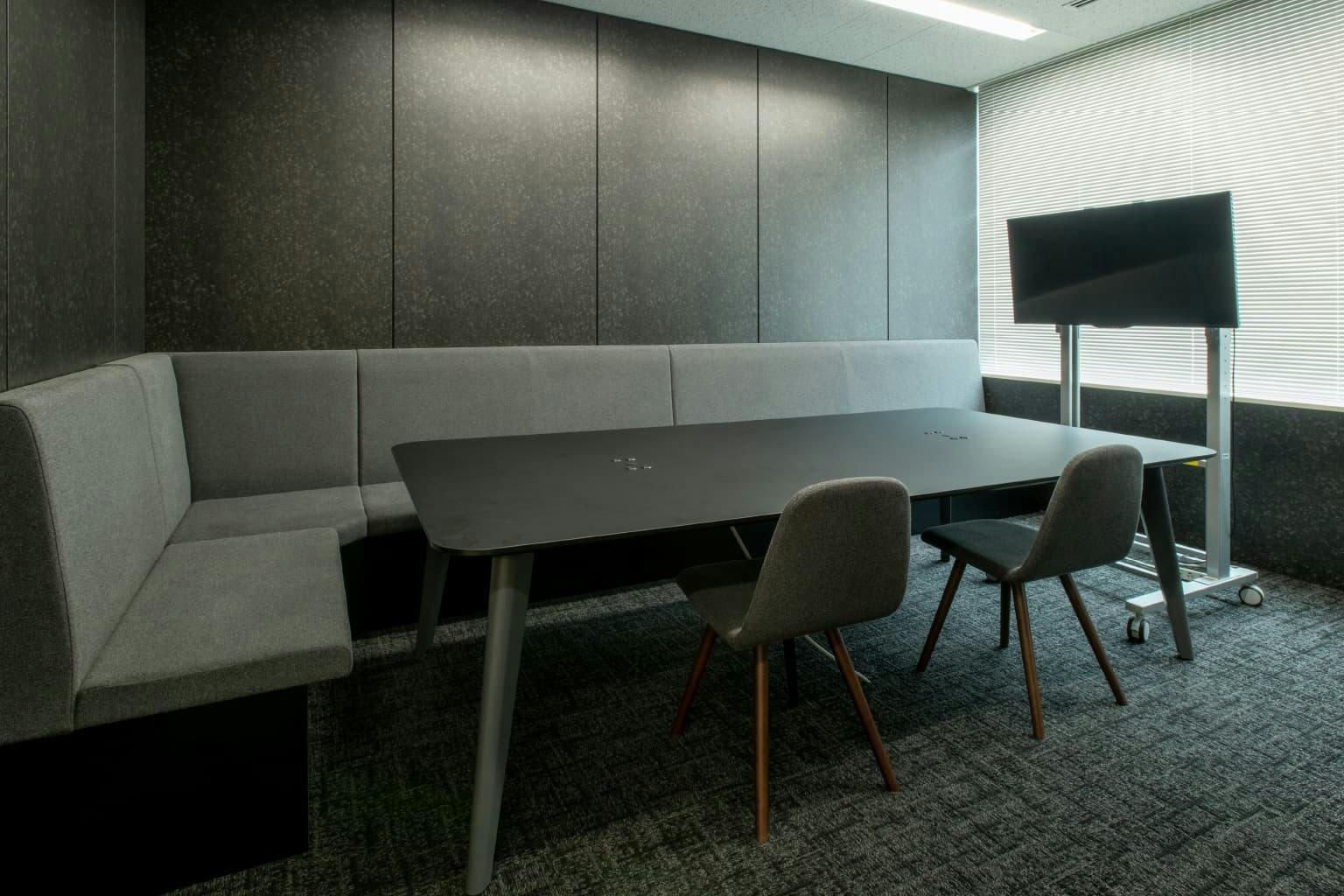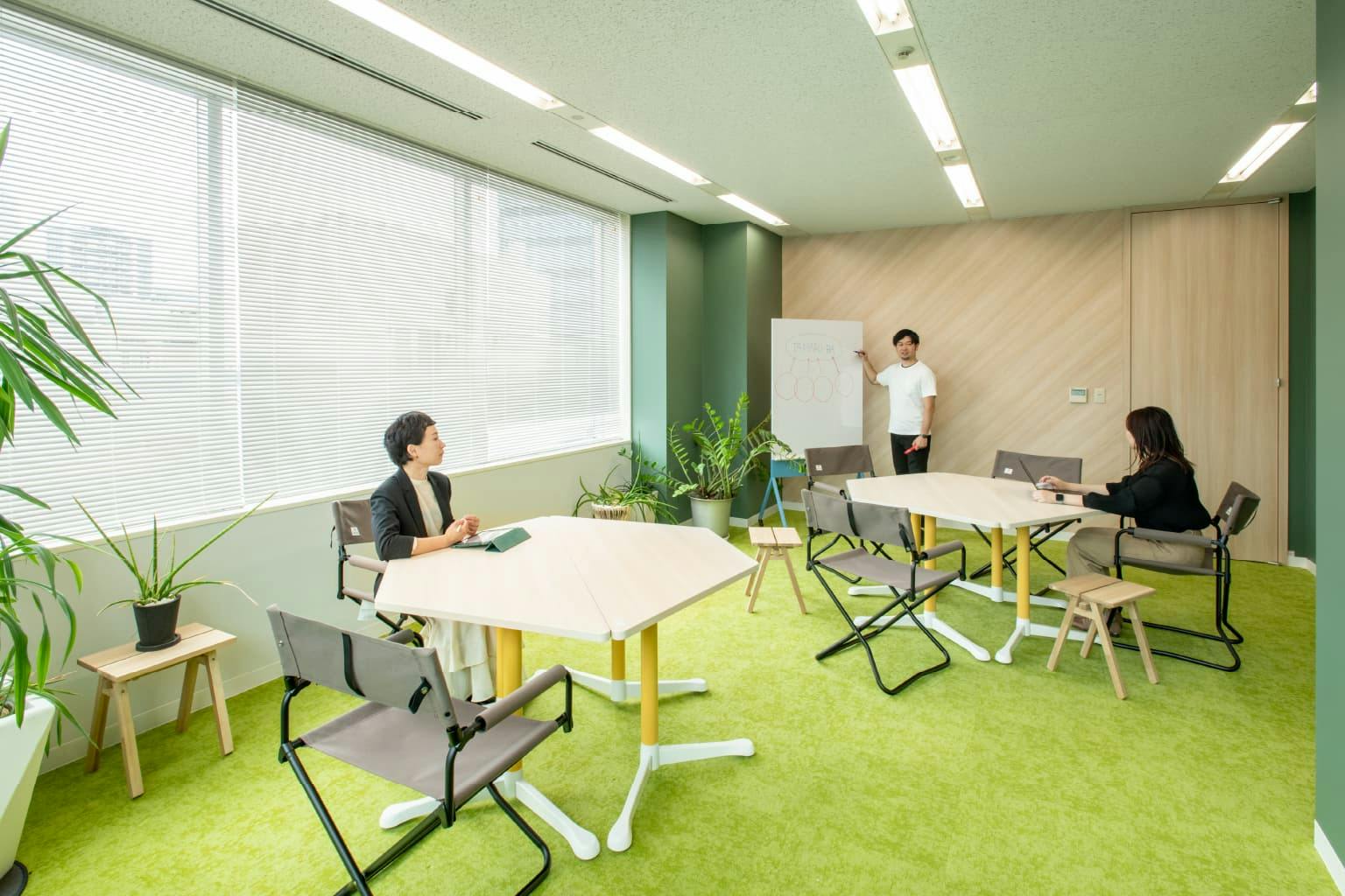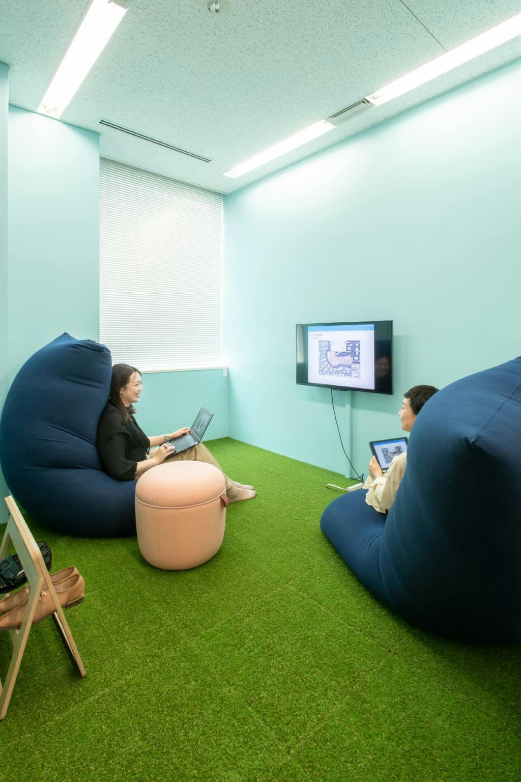 窓側の個室エリアは既存の部屋を利用してつくられた、社内会議やリラックスができる環境です。 3つの部屋はそれぞれ異なる用途と特徴を持った「〇〇ニワ」という名前が付けられています。 社長もフリーアドレスにしたことで不要となった社長室は、装いを新たに「ナカニワ」に生まれ変わりました。 芝生を模したタイルカーペットとアウトドアチェアが、まるでピクニックにでも来たかのような雰囲気を演出しています。 リアルグリーンも多く開放的な部屋になっています。 隣の「ハコニワ」は、土足厳禁で靴を脱いでくつろげるスペース。 仕事で疲れた体をストレッチしたり、ビーズクッションでゴロンとリラックスしたりしながら会話を楽しめます。 一方、「ウラニワ」は照明の明るさを抑え、ムーディーで落ち着いたカラオケルームのような会議室。 来客会議室としても使用でき、社内で好評です。