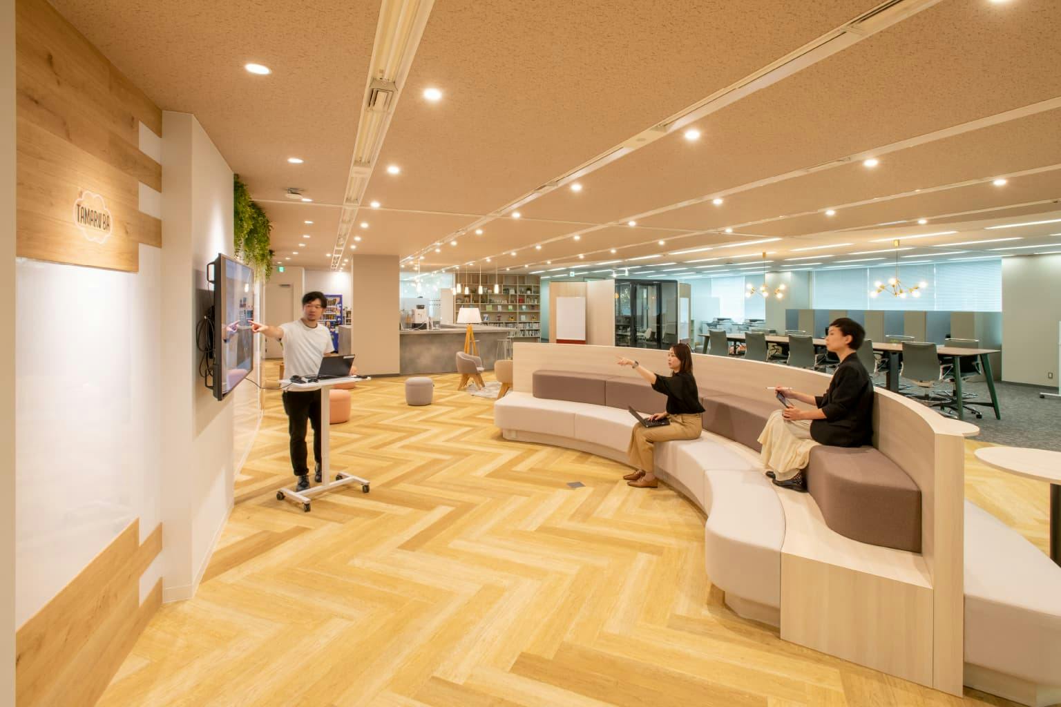 新オフィスは、ワンフロアをほぼ壁で仕切らないオープンで開放的なワークスペースになっています。 100%フリーアドレス運用で、ビッグテーブルやファミレスブース、集中ブースなどシーンに応じてワークスタイルを選べる、ABWを取り入れたオフィスです。 TAMARU BA付近には気軽にミーティングを行える雰囲気がありますが、そこから奥に行くにつれて、段々と集中空間に移っていく設計です。
