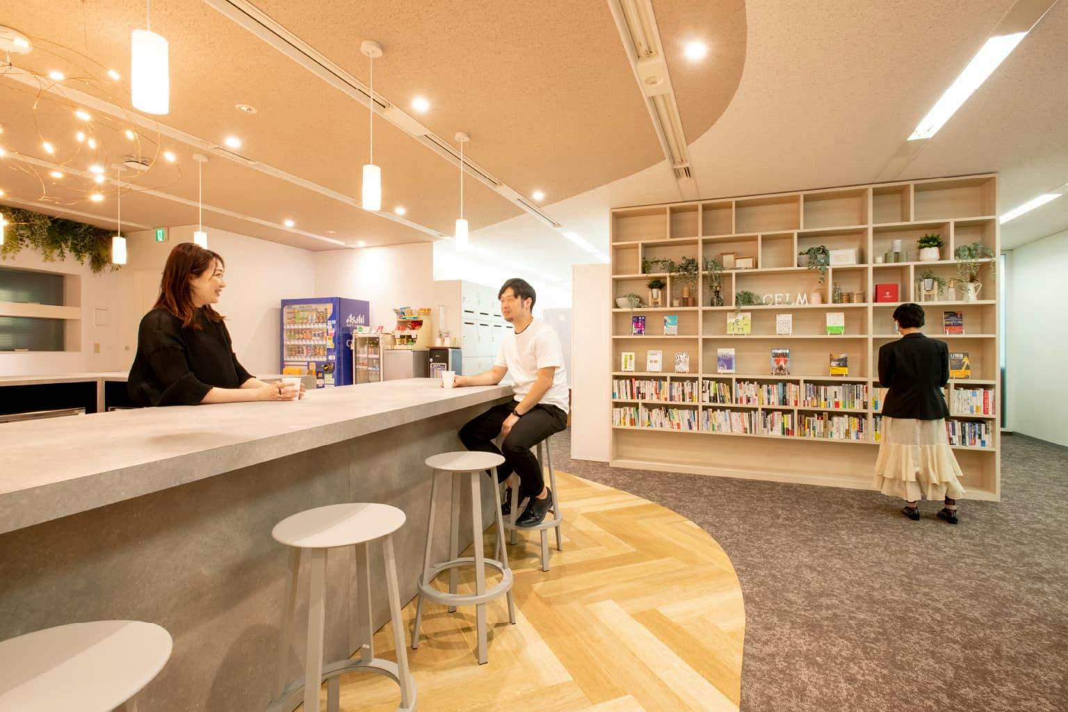 時にはコーヒーを片手に、キッチンカウンターの隣のライブラリーで調べものや読書をする社員の姿も。 まるでブックカフェにいるかのようなライブラリーでは、社長と社員のお気に入りの本を自由に貸し借りできます。 本のセレクトを通して、社員も社長の頭の中やこれからの会社のビジョンを覗き見できるかもしれません。 飲食や読書の効果でリラックスした状態だからこそ生まれるコミュニケーションもあるのではないでしょうか。