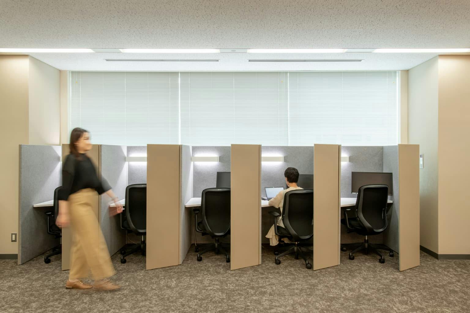 オープンな執務エリアのなかにも、クローズドな個室ブースエリアが2か所設けられています。 WEB会議や社内外のオンライン面談などが主流となり、少人数での個室利用のニーズが高まったことから、4人用フルクローズ型ワークブースを6台設置しました。 6台すべてがいつも埋まるほど、人気の高いエリアです。 そのうち2台は、オンライン研修などにて長時間ひとりでこもっても居心地が良いように、1~2名で使う広めのブースになっています。
