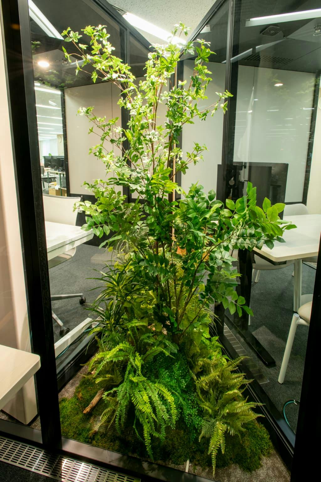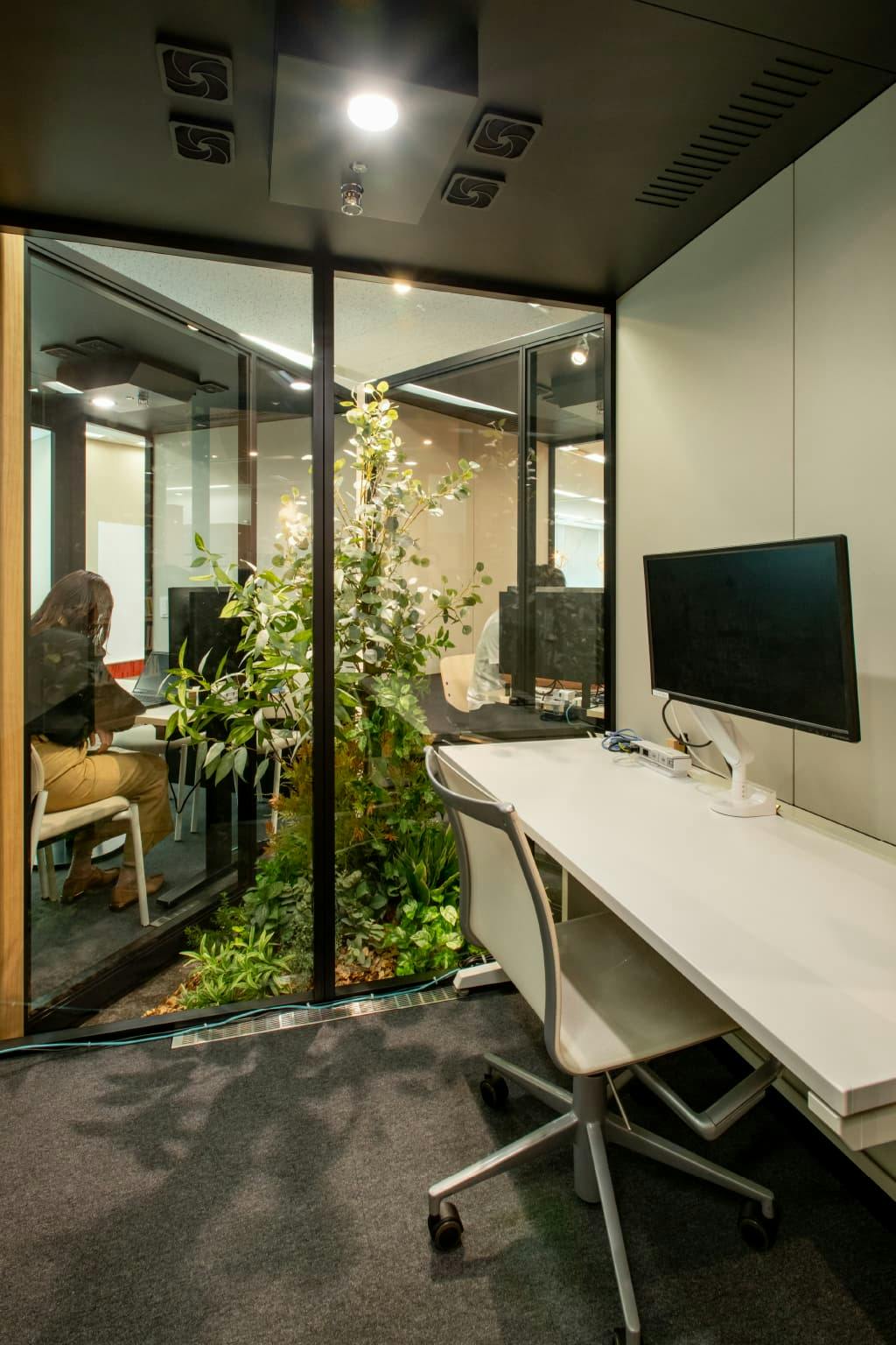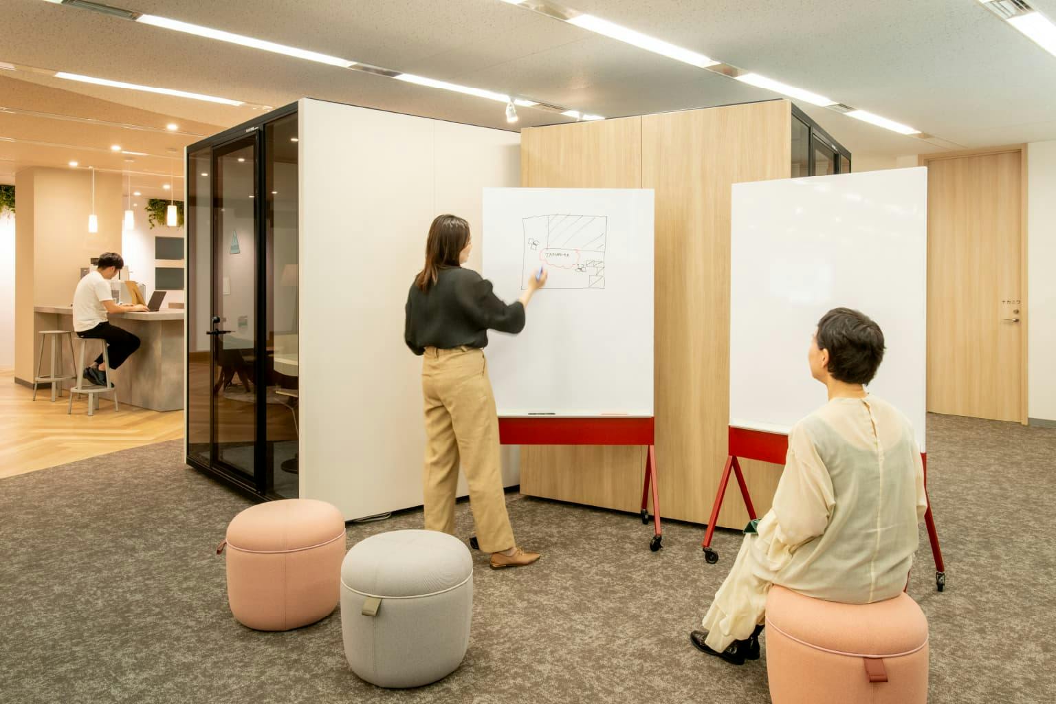 このブースもただ整然と並べるのではなく、住宅の街区ごと開発するときの発想からヒントを得て、街並みのようにずらして配置することで空間の余白を作り出しています。 ブース3台の角度を変えて並べ、中心にできた三角形の空間にグリーンを飾り、中庭のようにブース内からも緑を楽しめるスペースとなっています。 実際にブース内に入ってみると、外の喧騒から離れ静かな空間の中で集中して作業を行えます。 さらに、各ブースにはそれぞれ香りの異なるアロマを用意。 “視覚”と“嗅覚”の両方から癒しを与えてリラックス効果も抜群です。 また、ブースをずらして並べ出来た外側の余白も有効活用。 可動式のホワイトボードを設置することで、ぱっとミーティングを行えるスペースになっています。
