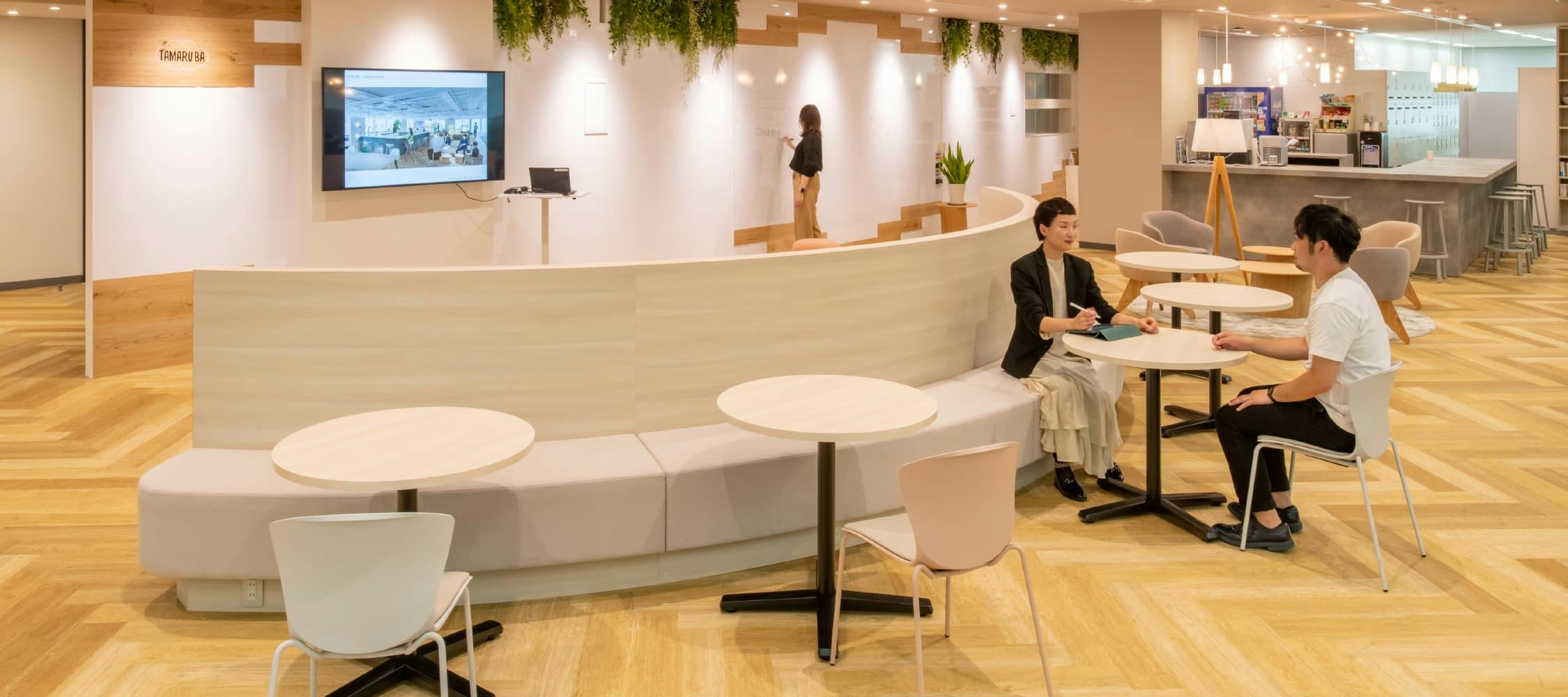 そこで、お客様のコーポレートスローガンである「Activate Your Potential」を象徴する「場」をつくることをご提案しました。 新しいオフィスでリアルにコミュニケーションをとることで、社員同士でどんどんアイデアをアウトプットし、「たまったモノから新しいモノが芽生えるように!」という想いを込めてコンセプトは「TAMARU-BA(溜まる場)」としています。