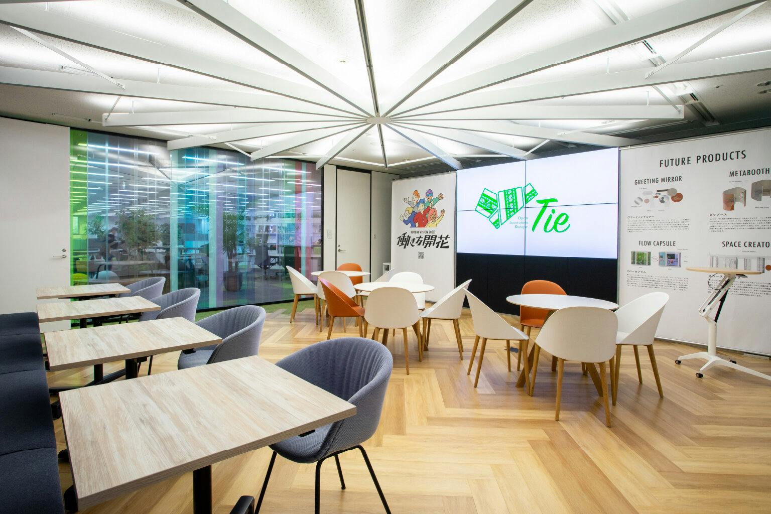 新しい価値は決して社内だけで生み出せるものではありません。 HAPPI LABOでは、新たな価値創造の場となる共創空間 「Open Innovation Biotope "Tie"(オープンイノベーションビオトープ "タイ")」を併設し、多様な方々と出会い、繋がり(Tie)、次のアクションへ挑戦する場づくりを目指しています。 Tieのロゴマークも、地元学生とのつながりを大事にし九州大学芸術工学部の学生とともに考えデザインされました。 オカムラでは、オフィス家具づくりを中心に理想の働き方について日々考え、お客様の働く場づくりのお手伝いをしています。 ここではそんなオカムラのエキスパートや外部の共創パートナーが中心となり、働き方や働く場づくりを参加者とともに考えるトークイベントやワークショップを開催しています。