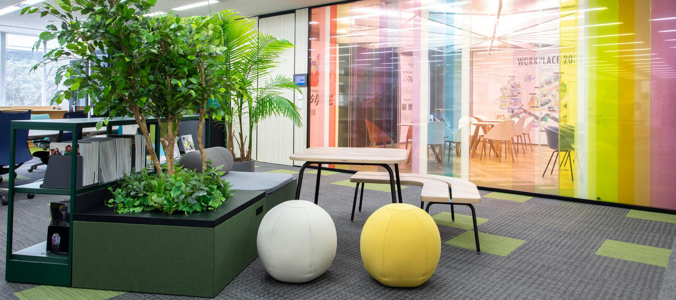 オカムラは自社拠点オフィスを実証実験の場と位置付け“ラボオフィス”と呼んでいます。 自ら働き方改革を実践し、そこで得られたアンケート結果や体験を顧客へ還元するべく、同拠点は毎年オフィスのリニューアルを行っています。