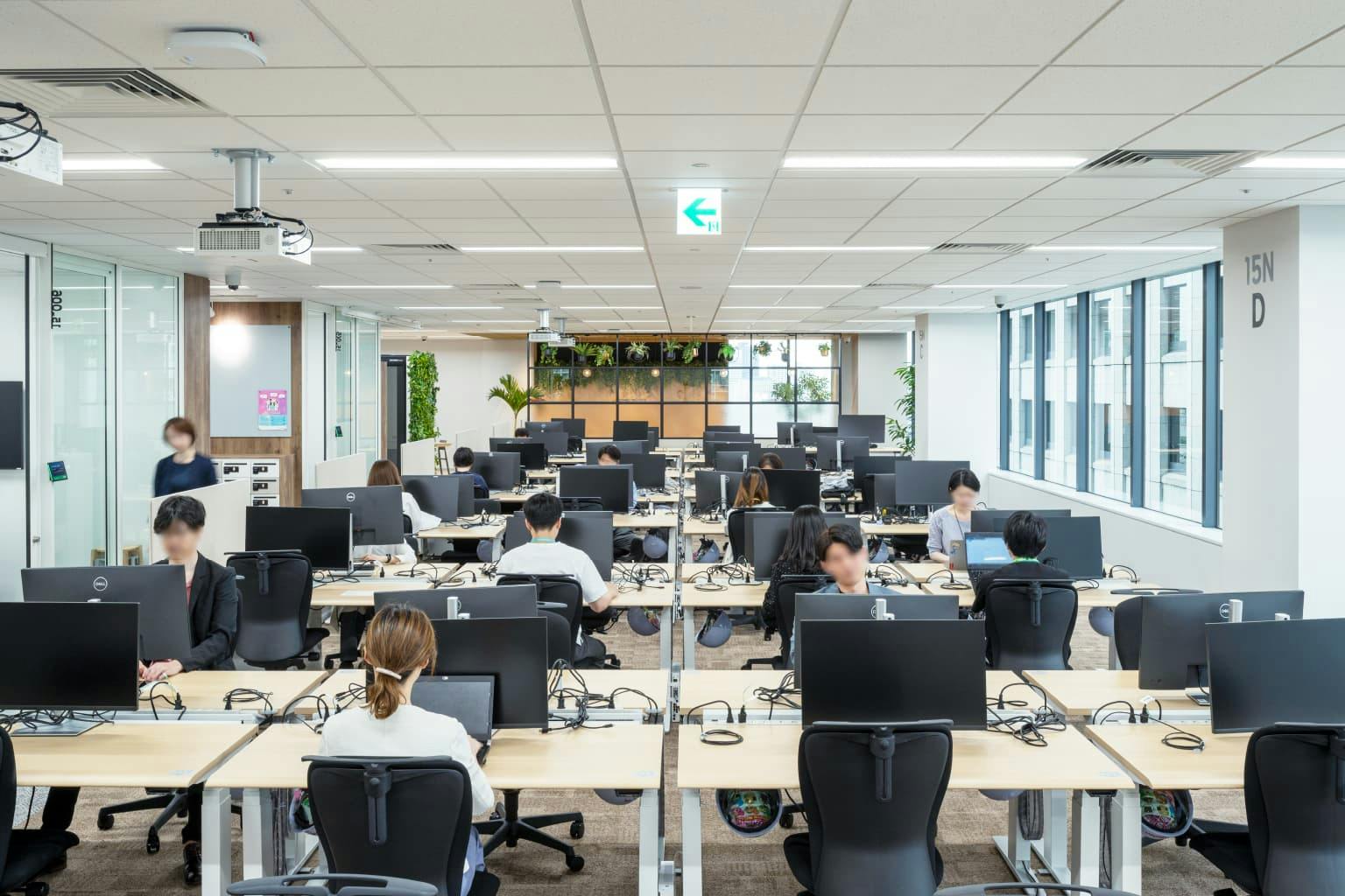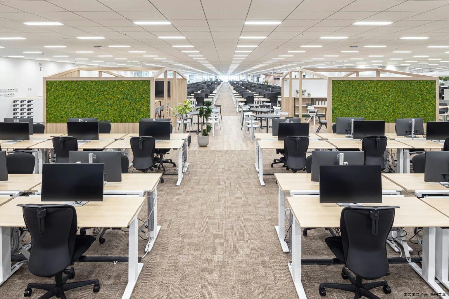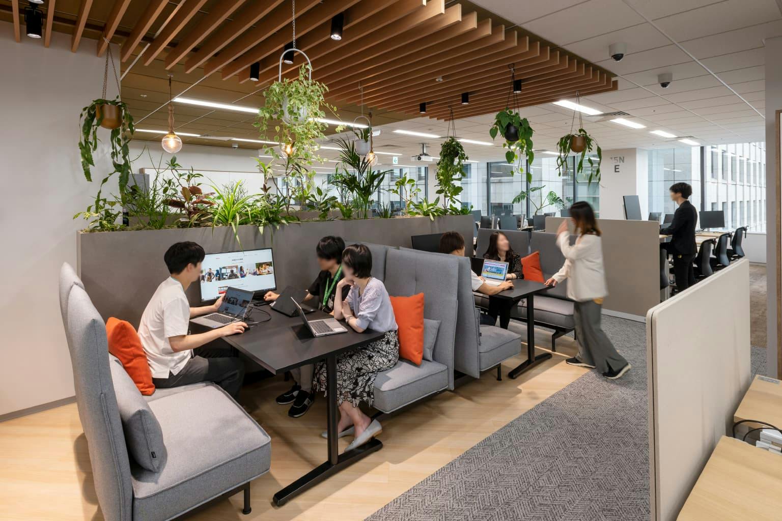 一方、オフィスのかたちに合わせた独自の設計もあります。 新宿オフィスはサッカーコート一面分におよぶワンフロア。 広大な空間の解放感を保ちながら、コミュニケーションを活性化し、一体感をつくりだす工夫が施されています。